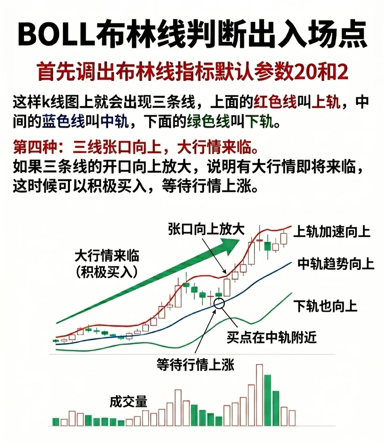 - 策略:「积极买入,等待行情上涨」,买点参考中轨附近。开口放大+中轨向上,是趋势强化的信号(多头力量加速积累),此时介入有望捕捉主升浪。