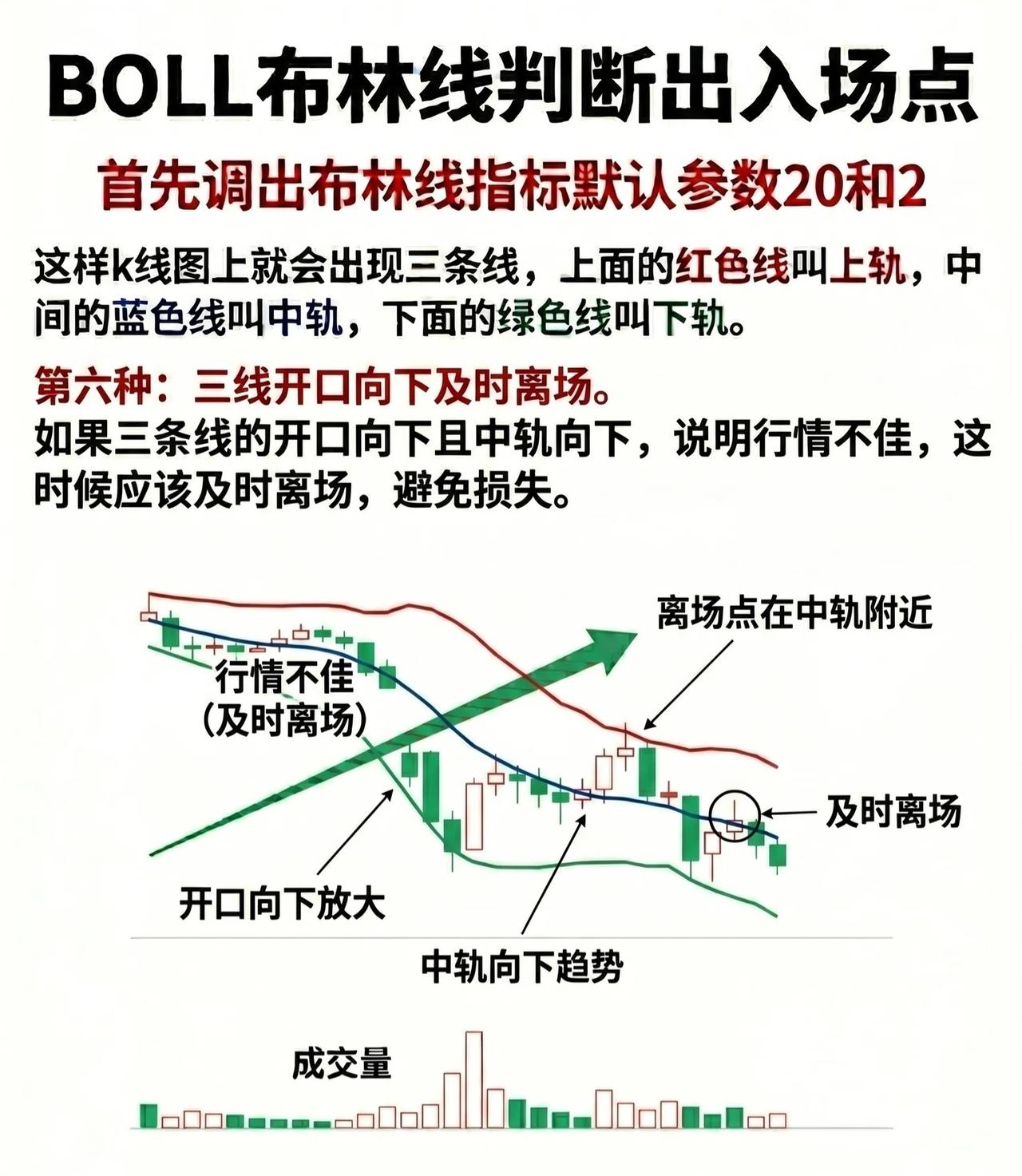 - 策略:「及时离场」,离场点参考中轨附近。开口向下+中轨向下,是空头力量主导的信号,继续持有可能面临更大损失,需果断止盈/止损。