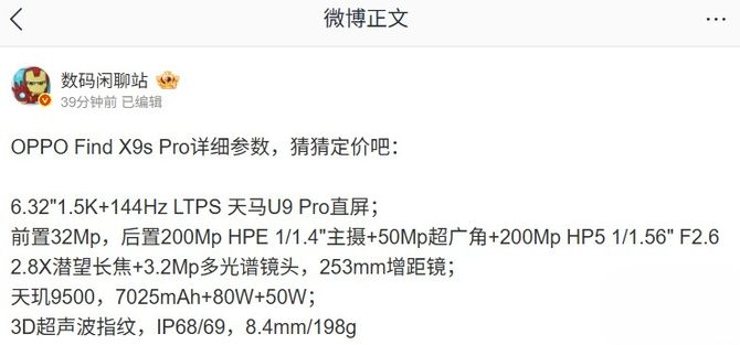 4月17日消息,博主@数码闲聊站汇总了OPPOFindX9sPro详细参数,新机将于4月21日晚间19:00正式发布。该机配备6.32英寸1.5K分辨率144HzLTPS天马U9Pro直屏。