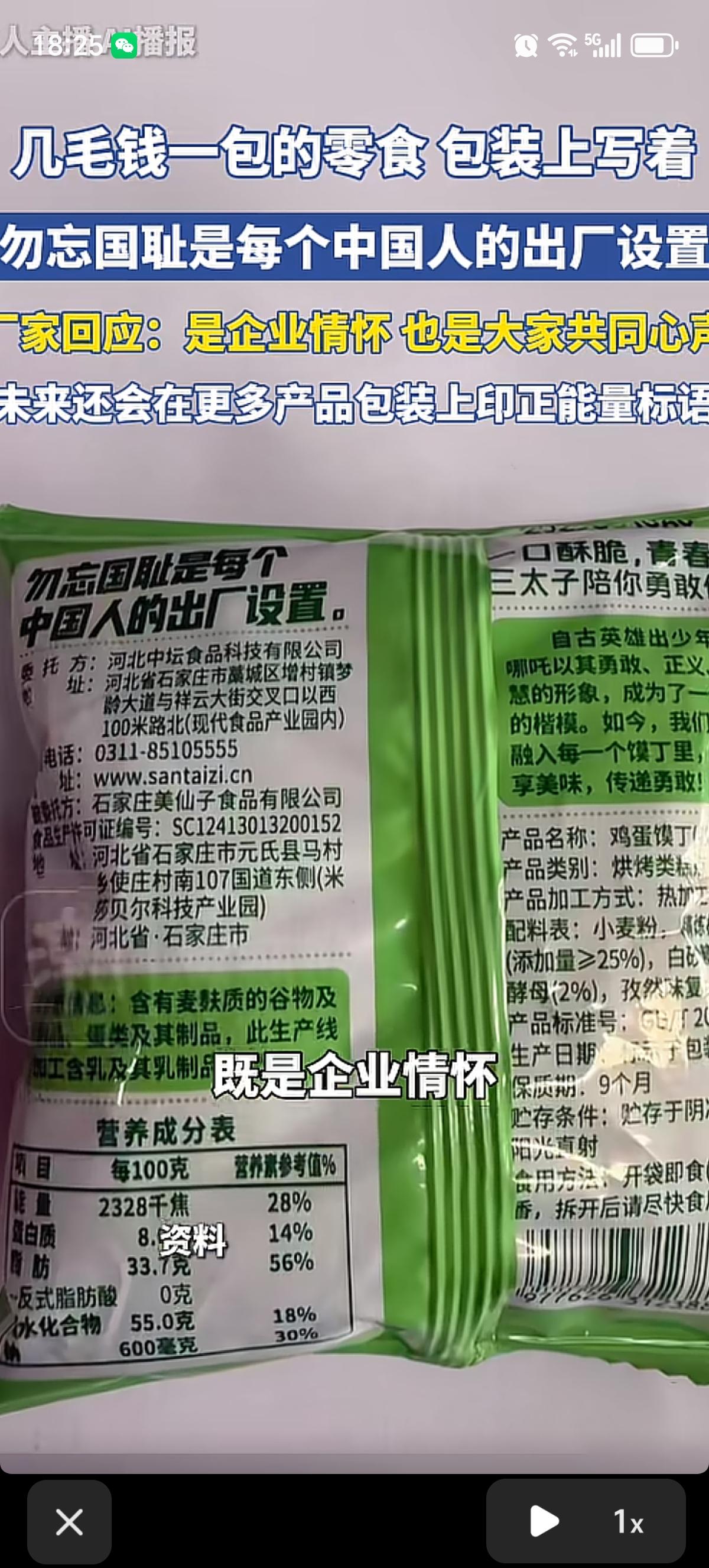 有网友分享了自己几毛钱一包的零食“三太子”鸡蛋馍丁,包装上的标语很醒目:“勿忘国耻是每个中国人的出厂设置”。
