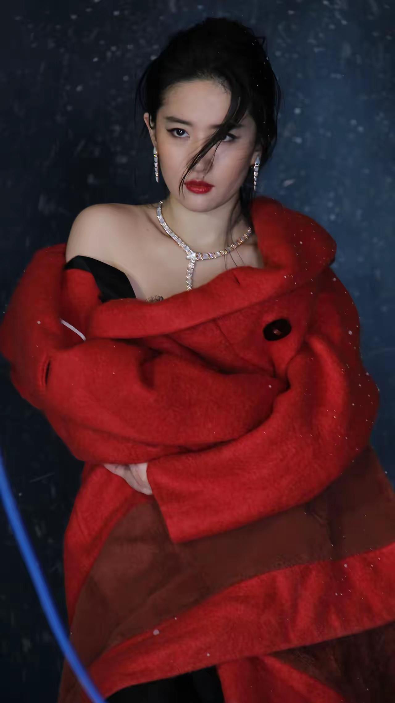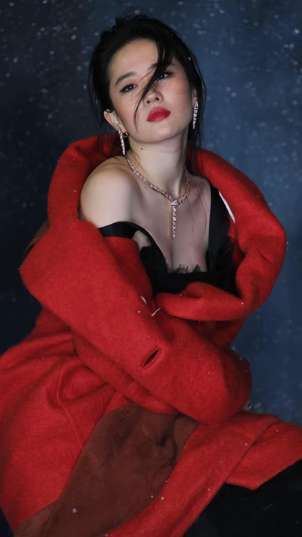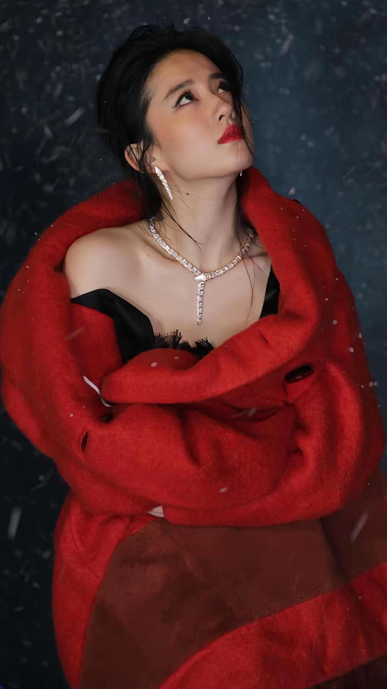 美女壁纸~刘亦菲,热烈的红大衣裹住清冷氛围感。刘亦菲露肩黑裙衬出优越肩颈,颈间耳畔的珠宝碎光流转,与明艳红唇相映成趣