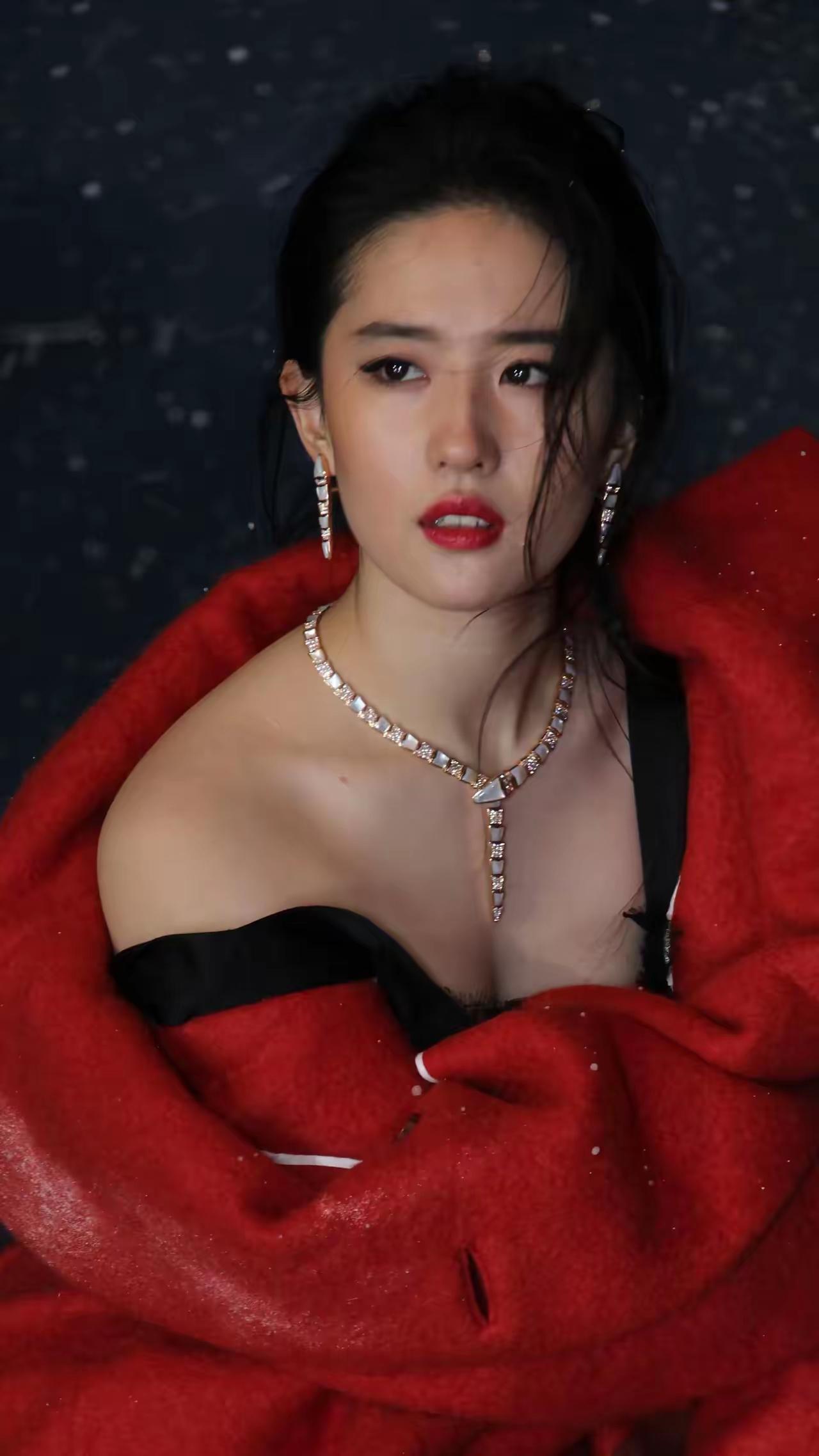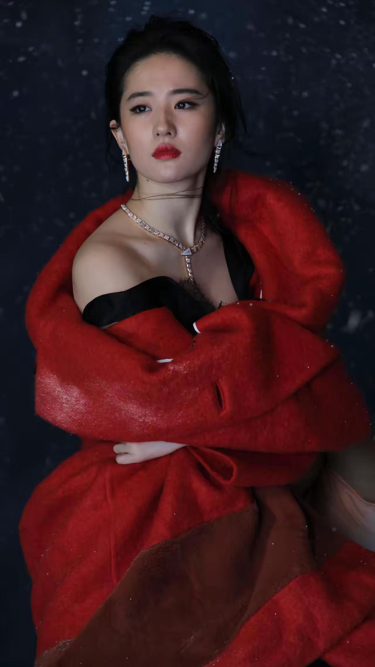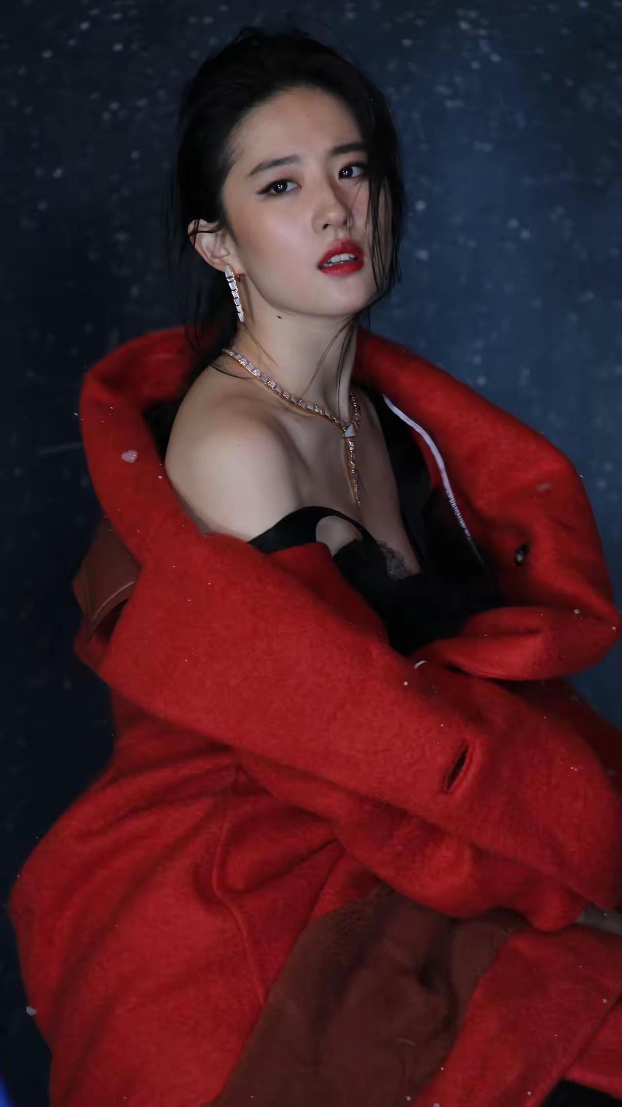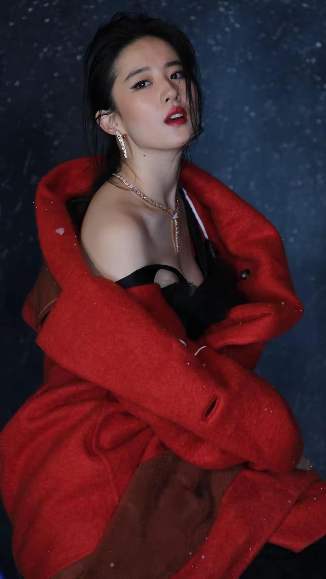 美女壁纸~刘亦菲,热烈的红大衣裹住清冷氛围感。刘亦菲露肩黑裙衬出优越肩颈,颈间耳畔的珠宝碎光流转,与明艳红唇相映成趣
