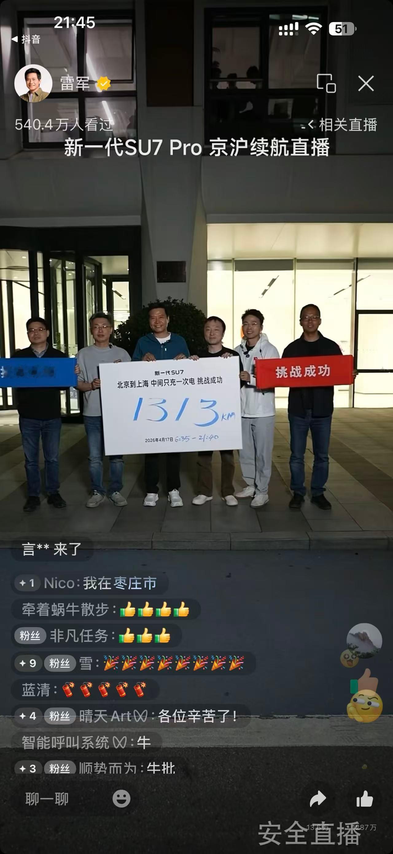 雷军达成京沪高速只充一次电雷军今天居然真的15小时全程直播,开着新SU7北京到上海1300公里高速,中途只充一次电顺利完成!说真的“只充一次电”的争议黑梗,本来就是有人在断章取义,这次续航测试既展现了新一代SU7的三电能力和超长续航,又让当年的曲解不攻自破,以后谁再拿这个说事,直接把直播成绩丢给他,这回应太漂亮了