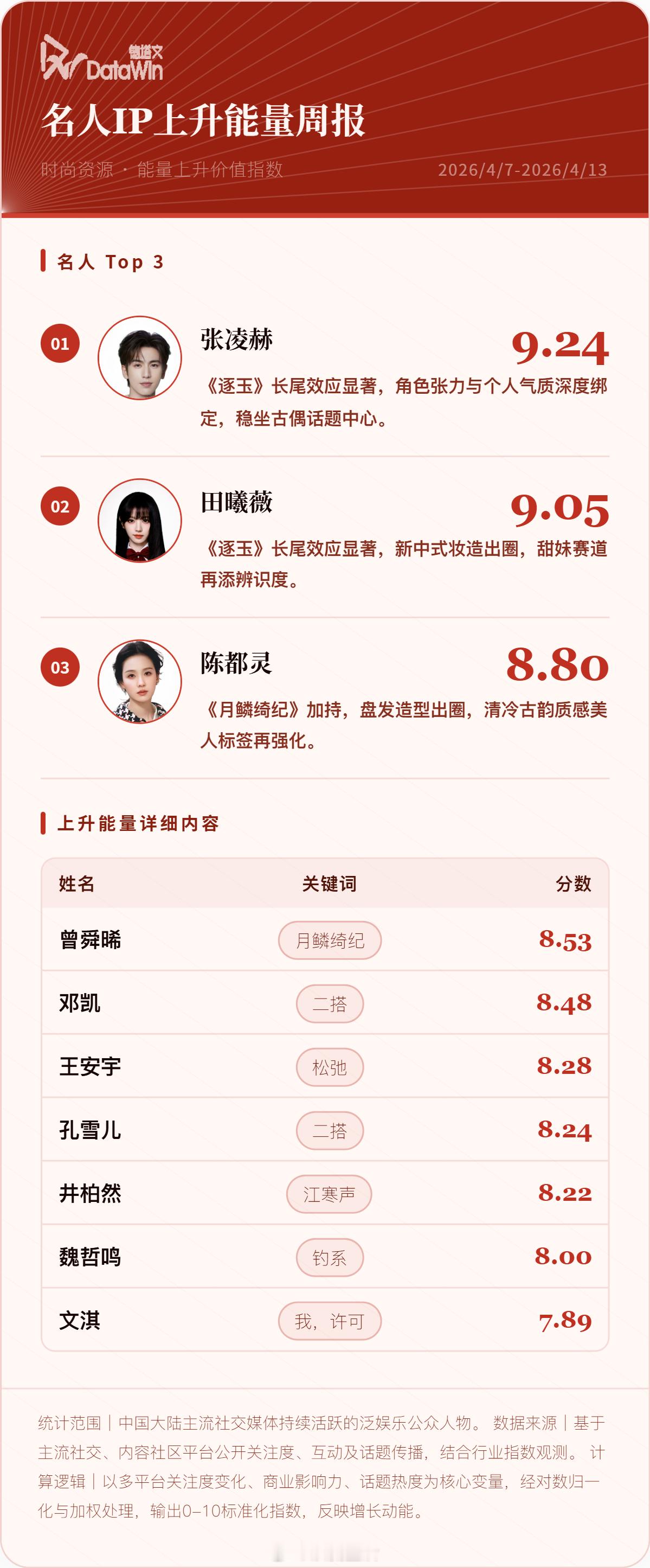 时尚资源 能量上升指数top3 张凌赫 田曦薇 陈都灵