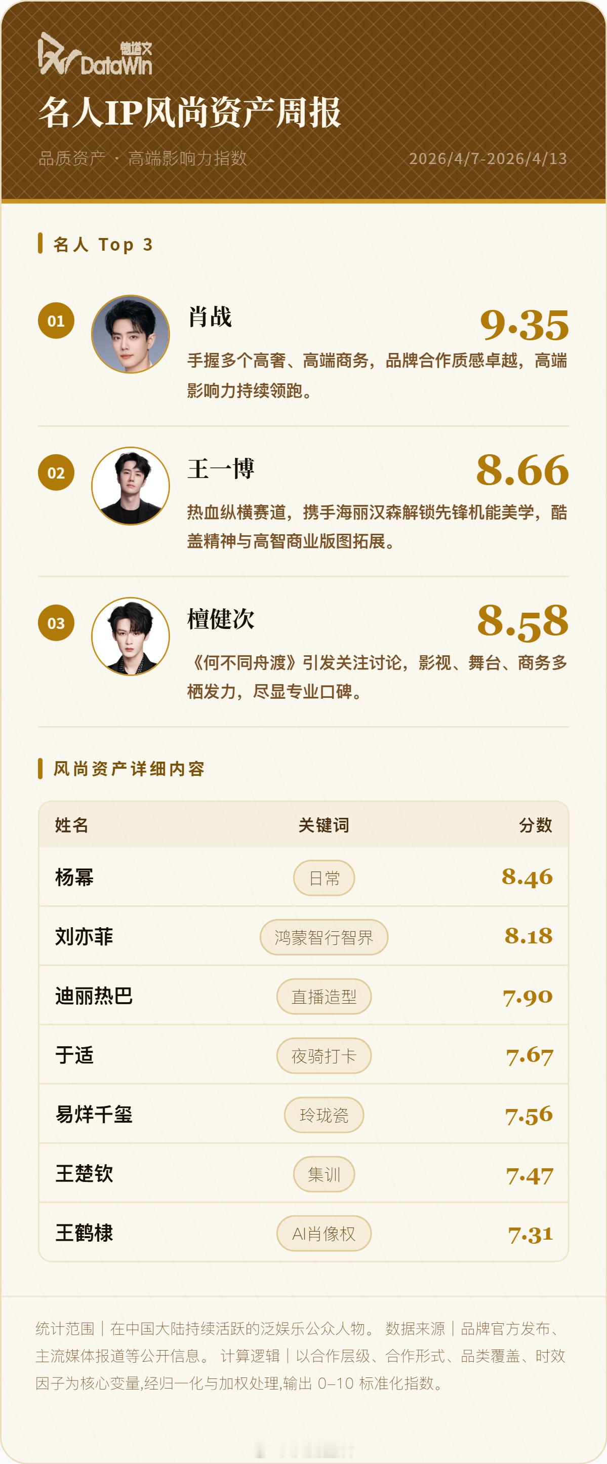 德塔文名人IP周报来了 品质资产 高端影响力指数top3 肖战 王一博 檀健次商