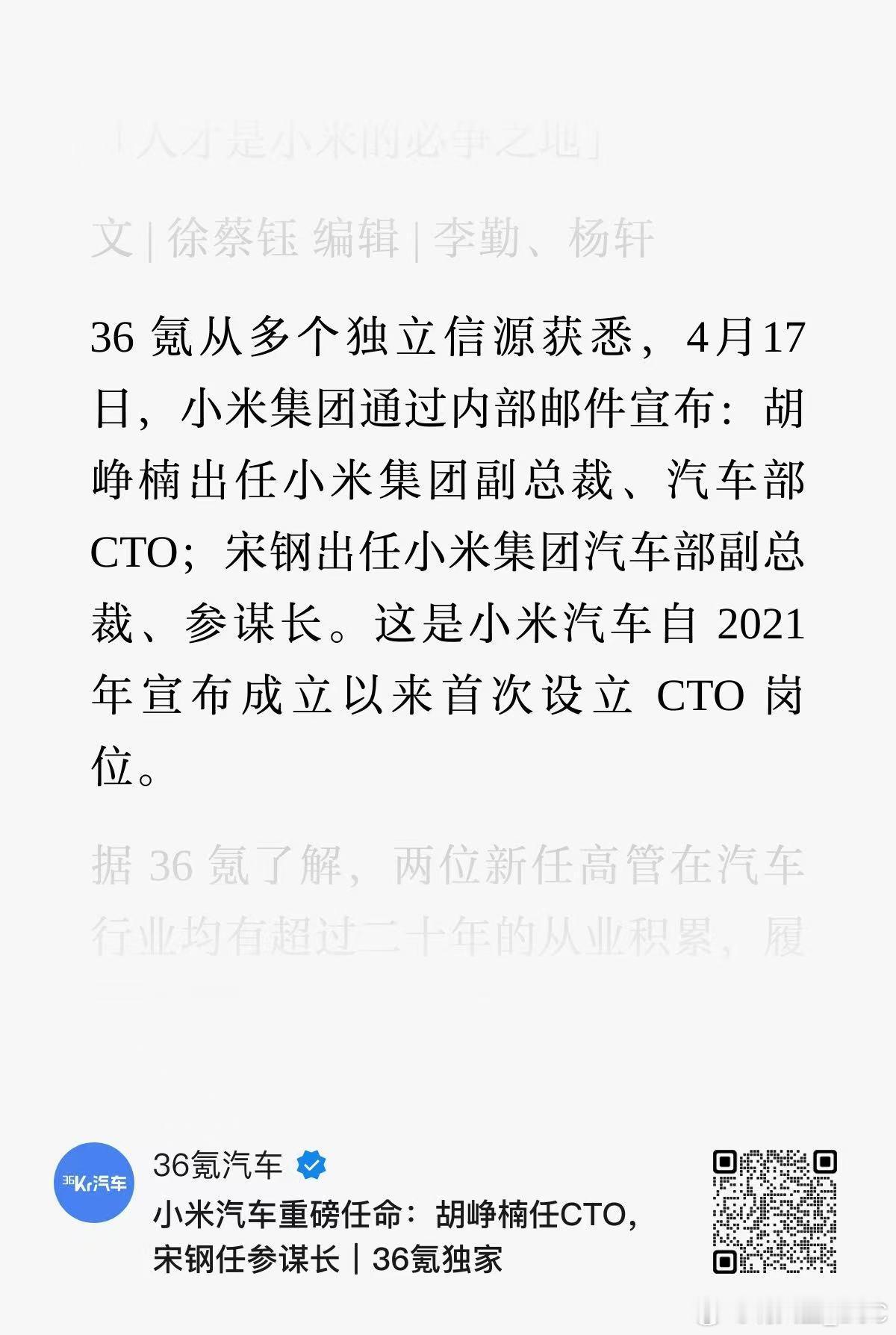 小米汽车成立5年了,首个CTO给了胡峥楠,正式成为最核心的技术掌舵人。