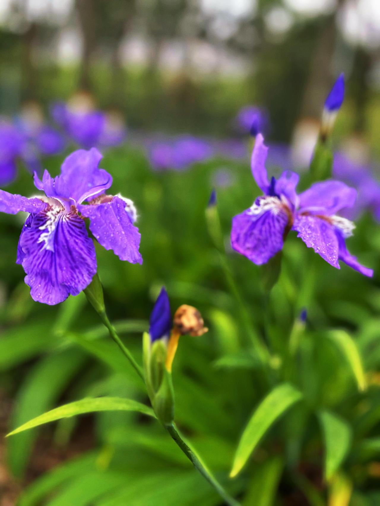 这些鸢尾长在水边,叶子修长挺拔,绿得发亮,像一把把出鞘的剑。花茎从叶丛中抽出来,顶端开着两三朵。有些还是花骨朵,紧紧地裹着,像蘸饱了墨的毛笔尖;有些半开着,露出一点紫色;那些全开的,便大大方方地展示着它们奇特的姿态——三片低垂,三片直立,像一群蓝蝴蝶停在枝头,随时要飞起来。