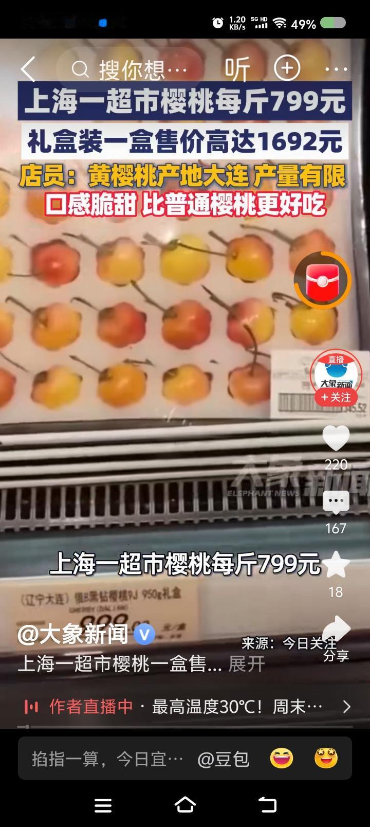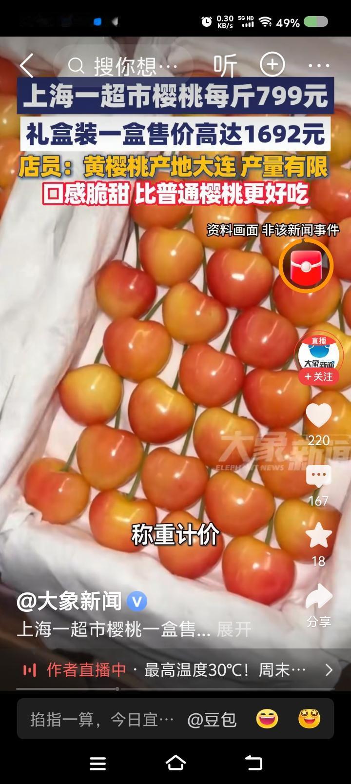 一斤799元的樱桃,你尝一个?—— 据报道,上海某超市樱桃一斤799元。店员称:
