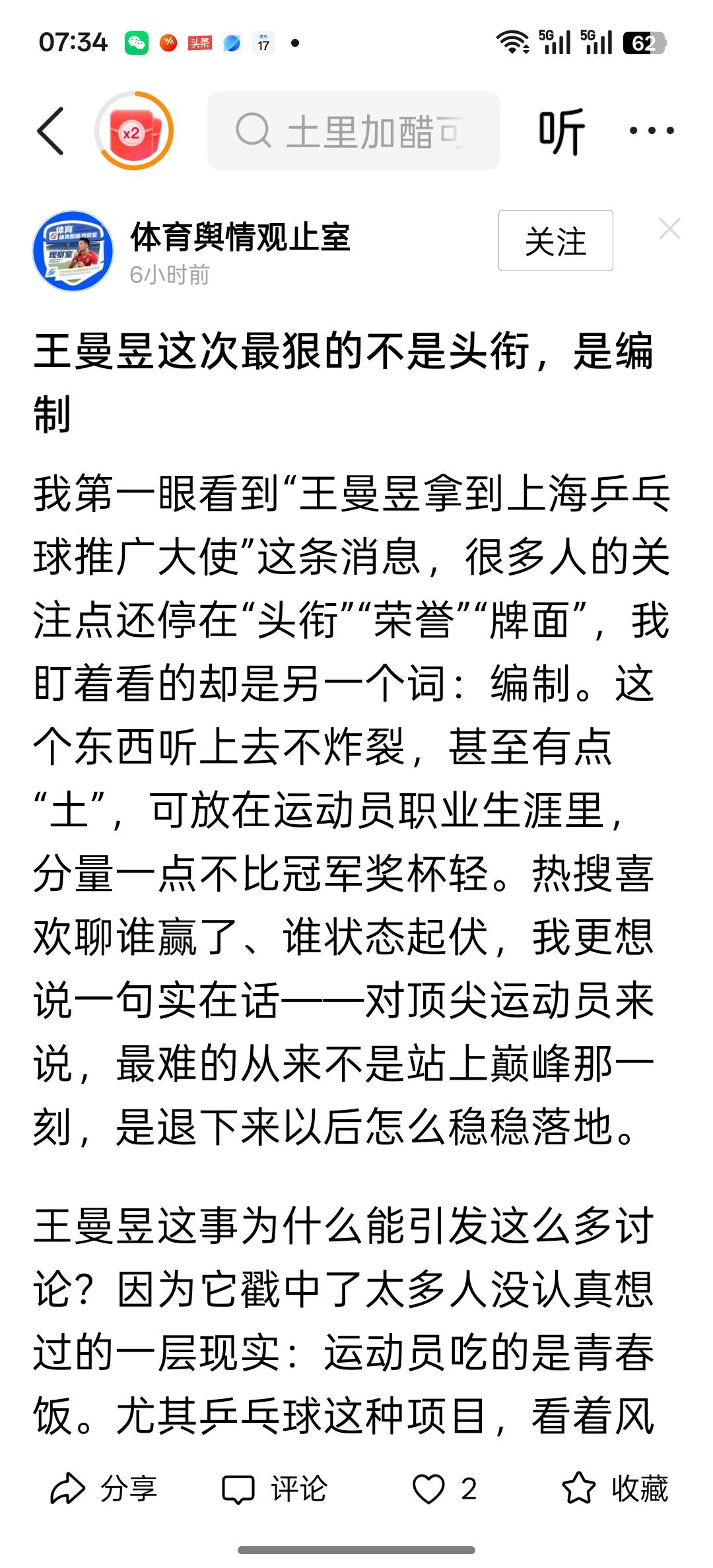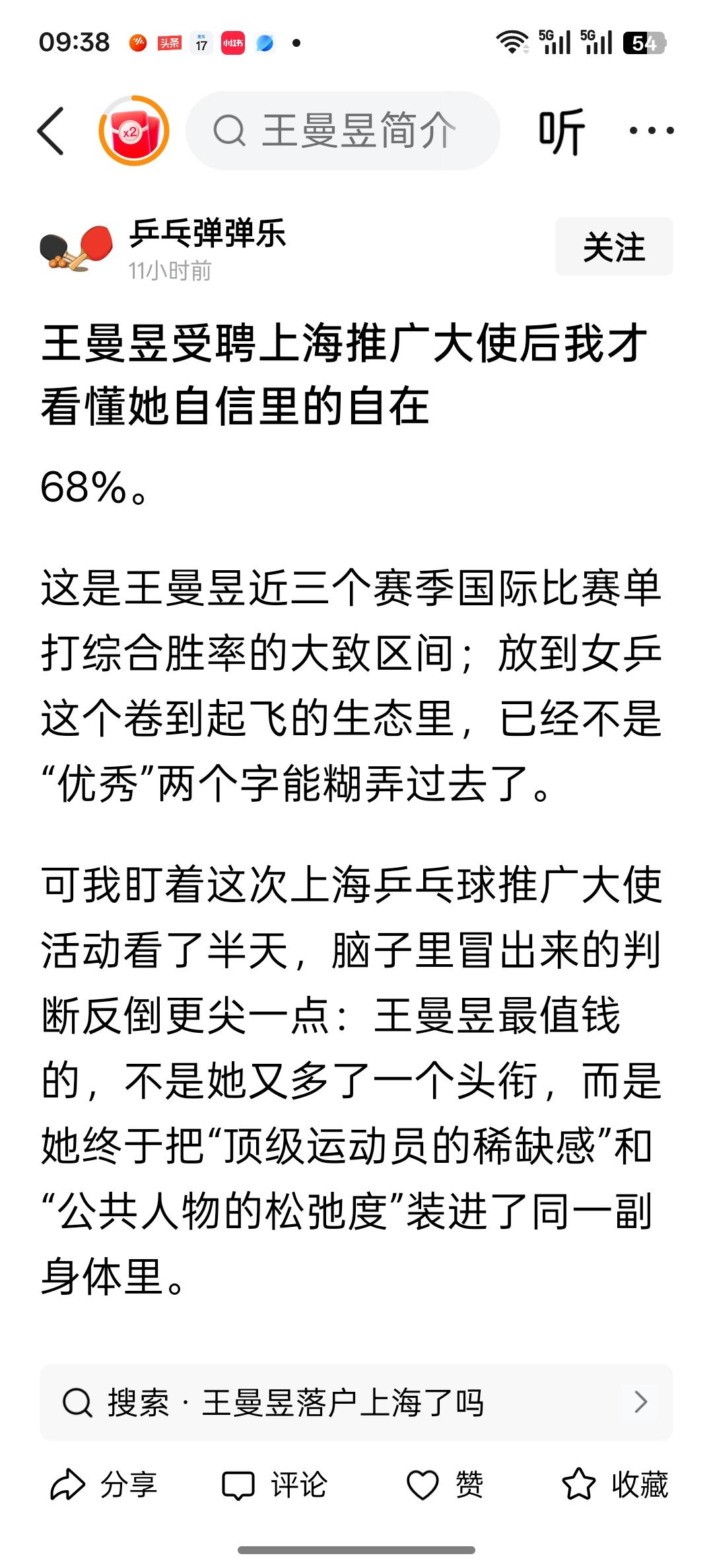 王曼昱王曼昱是现在国乒女乒团队核心成员、世界排名位居第二名,妥妥的超一流选手,两次夺得全运会女单冠军,可以说王曼昱的优秀是毋容置疑的,是不需要炒作的,然而,自孙颖莎被世界乒联加冕“超级巨星”后,一些人开始炒作王曼昱助力上海乒乓球运动“推广大使”,什么上海编制,什么上海户口,年薪多少多少,其实这些都是无稽之谈,第一这次受邀担任推广大使不是王曼昱一人,而且仅仅是一场活动而已,第二关于编制和户口以及年薪没有任何官方报道,第像王曼昱这种取得过优异成绩的运动员的退役安置户口所属地方政府都会妥善安排,而且现在王曼昱的人事关系就在黑龙江体育局,因此,没有根据的炒作王曼昱,对王曼昱只有伤害,没有帮助,而且也不要拿王曼昱和其他运动员相比,各有各自属于自己的的辉煌年代,现阶段王曼昱成绩不如孙颖莎是客观事实,孙颖莎不仅有年龄优势还有天赋优势、体能优势,成就优势,承认孙颖莎优秀,不等于否定王曼昱不优秀,包括王艺迪陈幸同蒯曼都非常优秀,现在女乒团队运动员都是全国乒乓球运动员中万里挑一的优秀人才,很多乒乓球运动员也是从七、八岁就开始刻苦的训练,家里也是投入大量的财力精力,但是最后连市队、省队都没进入。