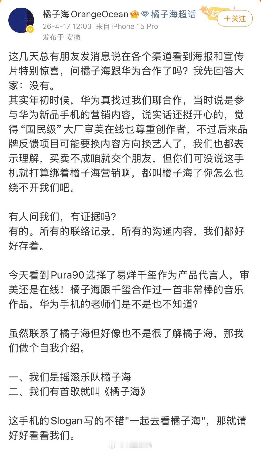 橘子海乐队 华为我觉得吧,如果华为能够跟橘子海合作,那肯定是一个好事情。之前的iQOONeo3、OPPO Reno6其实都跟橘子海合作过,iQOO是合作了首歌曲,OPPO是在发布会现场演唱过。之前华为的大型发布会其实开场都有舞美表演。如果跟橘子海合作,现场演唱一下,这个费用我觉得华为肯定也承担得起。如果按照橘子海说的,双方接触过,但最终没合作。说白了,华为的市场营销部门本身应该把这工作做得更好。最后,橘子海说侵权,这个我觉得大概率法院也不会支持。你没有合作成,看到华为宣传有关于橘子海的信息你生气也可以理解,但扯到什么任正非、余承东上,就有点过分了。
