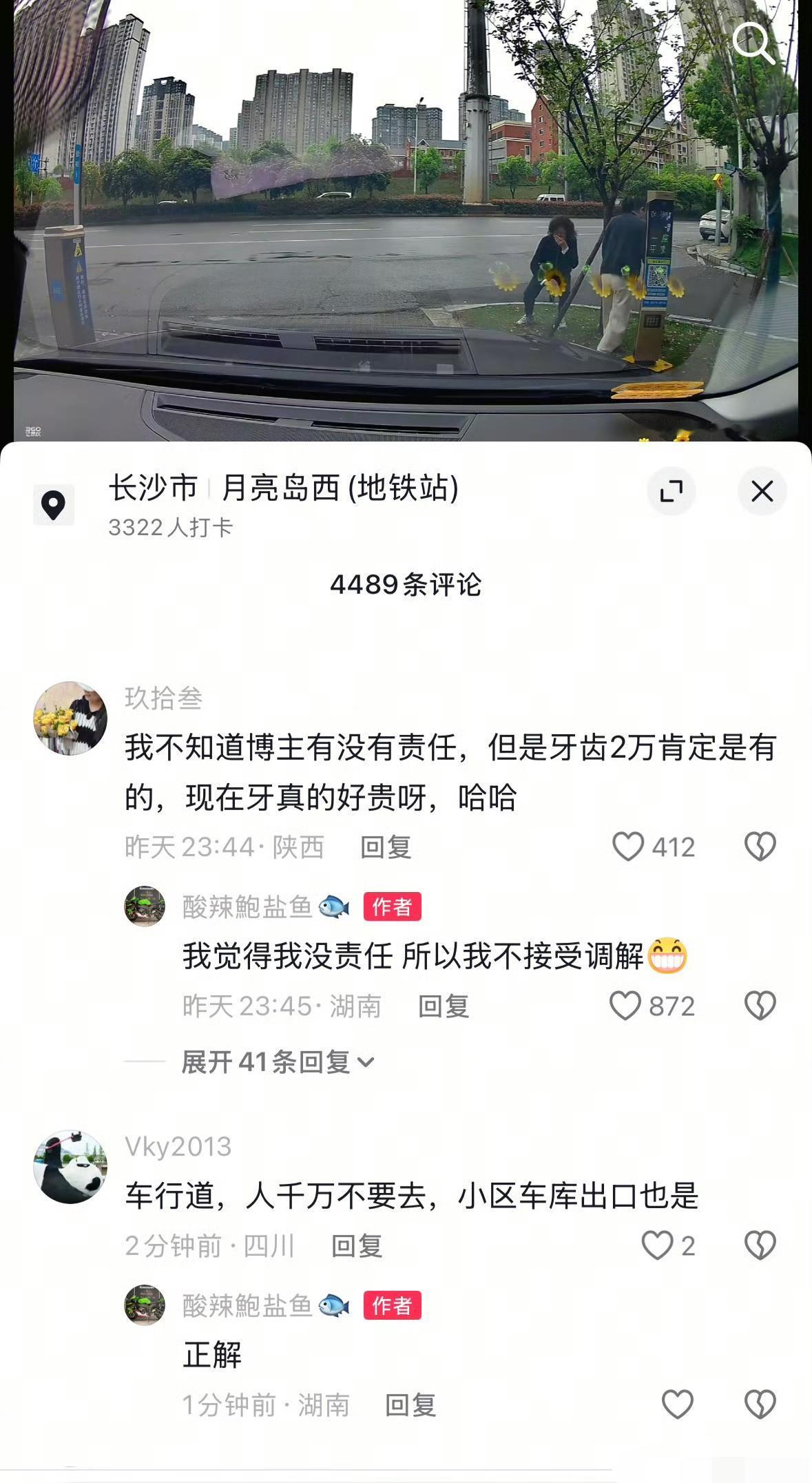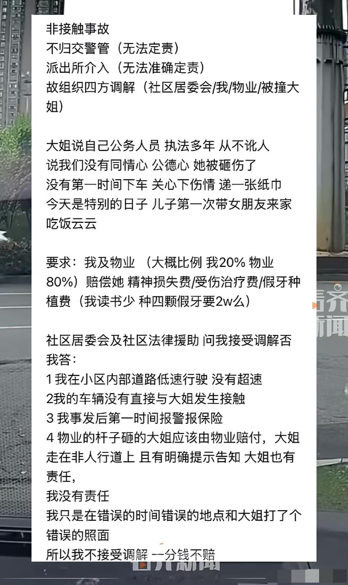 两女子从车辆出口通行,恰好一辆车经过抬杆砸掉了其中一个女子几颗牙,就是这么巧,事后女子找司机索赔 2 万,去种植 4 颗牙。长沙某小区,看监控视频的事发经过,这名司机开着车出小区,在小区门禁口,恰好两个女子从车辆出口闯卡,车道抬杆不偏不倚刚好戳中女子的脸部,导致牙齿被碰掉,女子当场捂着嘴巴蹲在地上,痛苦万分。司机立刻报了保险,报了交警。交警认为是内部道路,不归他管,警察来调解没有结论,后面在居委物业警察和当事人多方调解,要求司机赔偿 20%,物业赔偿 80%。光四颗牙的种植费就要2 万多块,司机觉得很冤枉,明明是女子违规擅闯车道,他没有超速,没有任何违规,为什么要赔偿?大家看看,司机有责任吗?