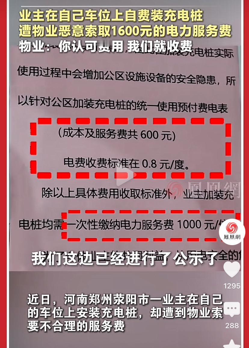 物业变着法的收钱,河南一业主在自己的停车位上安装充电桩被物业索要1600元的电力服务费,不缴钱物业就不会同意安装,业主认为不合理便举报到市场监督局,监管部门到物业调查要求拿出收费标准,物业说已经公示了,但物业拿不出合法的收取依据,物业立即改口说业主可以交也可以不交,但不交不会同意安装,反正就是霸王条款。