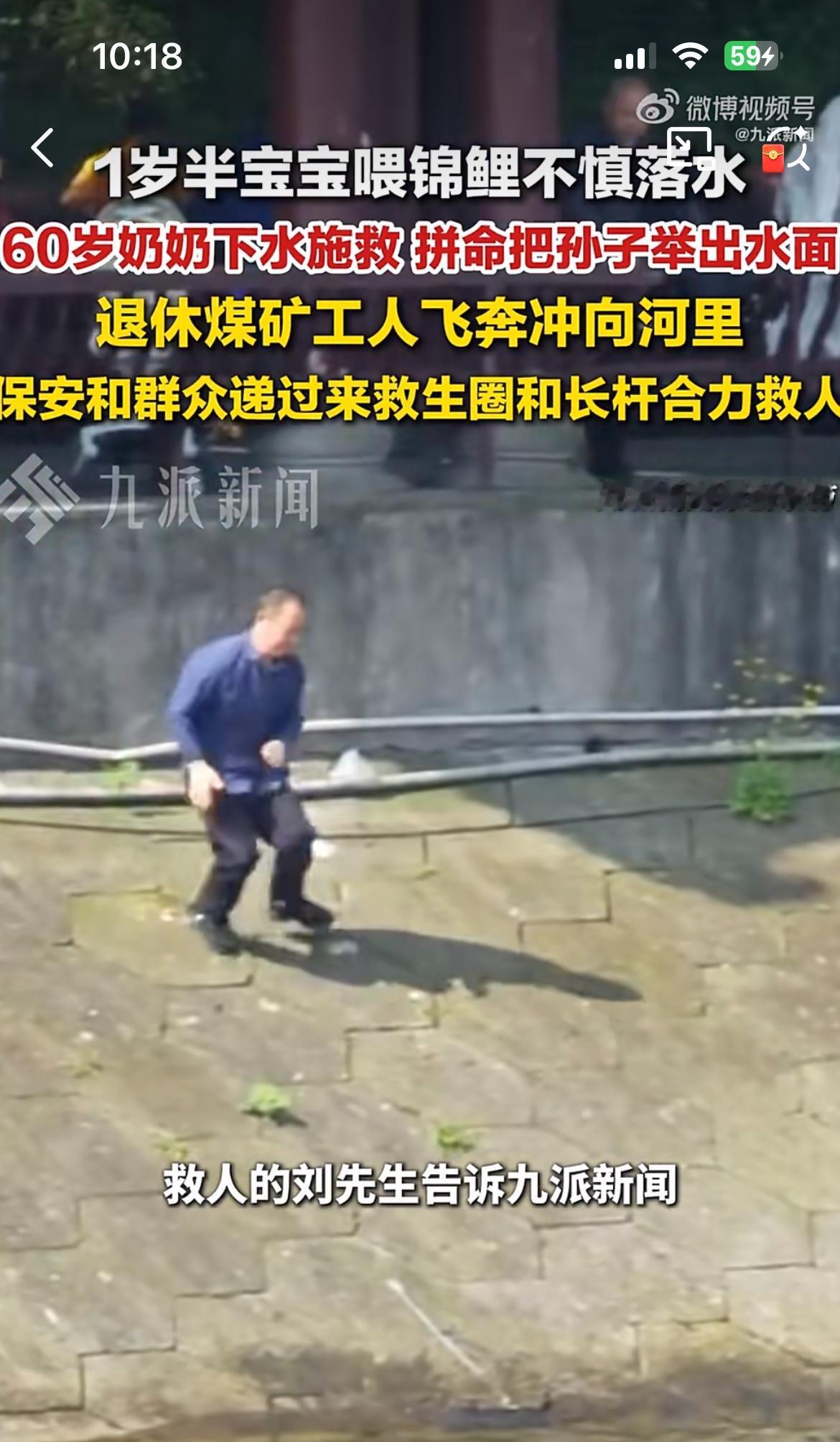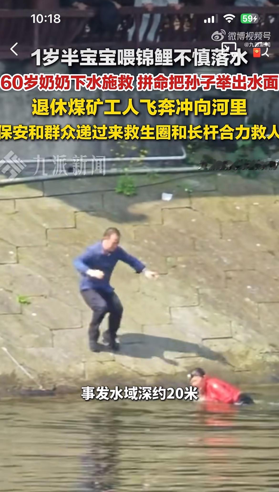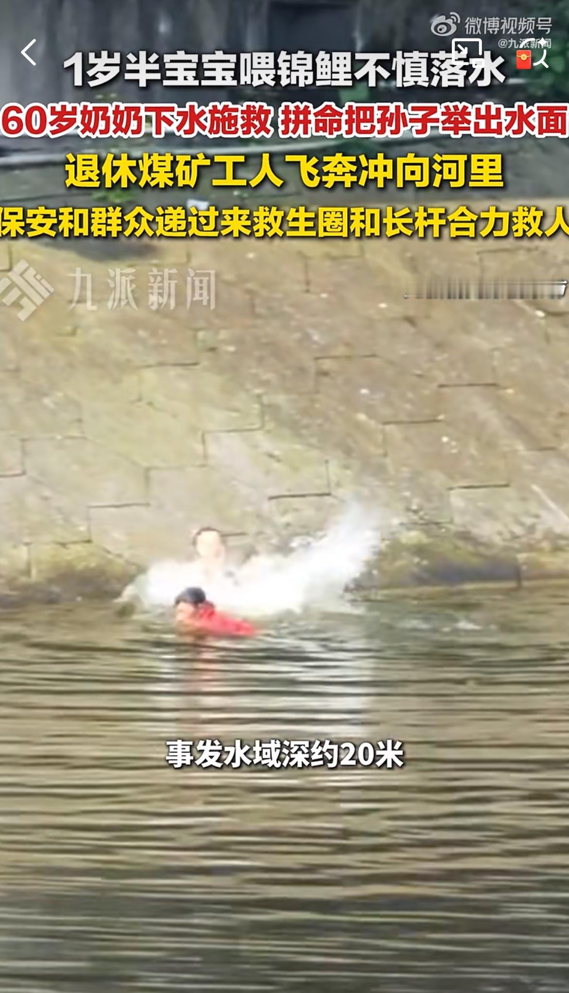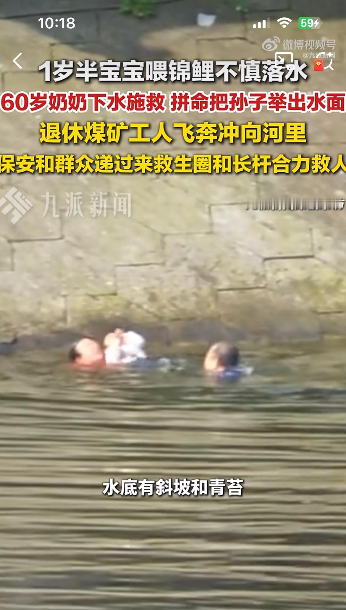 孙子喂锦鲤掉到水里,奶奶奋不过身去救,虽然她不会游泳,两人都在水里挣扎。一位退休的工人冲下水去施救,但是斜坡,水底还有青苔,根本站不起来,抓不住,三人挣扎了几分钟。还好公园人多,大家纷纷参与救援,才合力把三个人救上来。救人的老工人浑身发抖,血糖偏低,如果再晚一点,可能后果不堪设想。