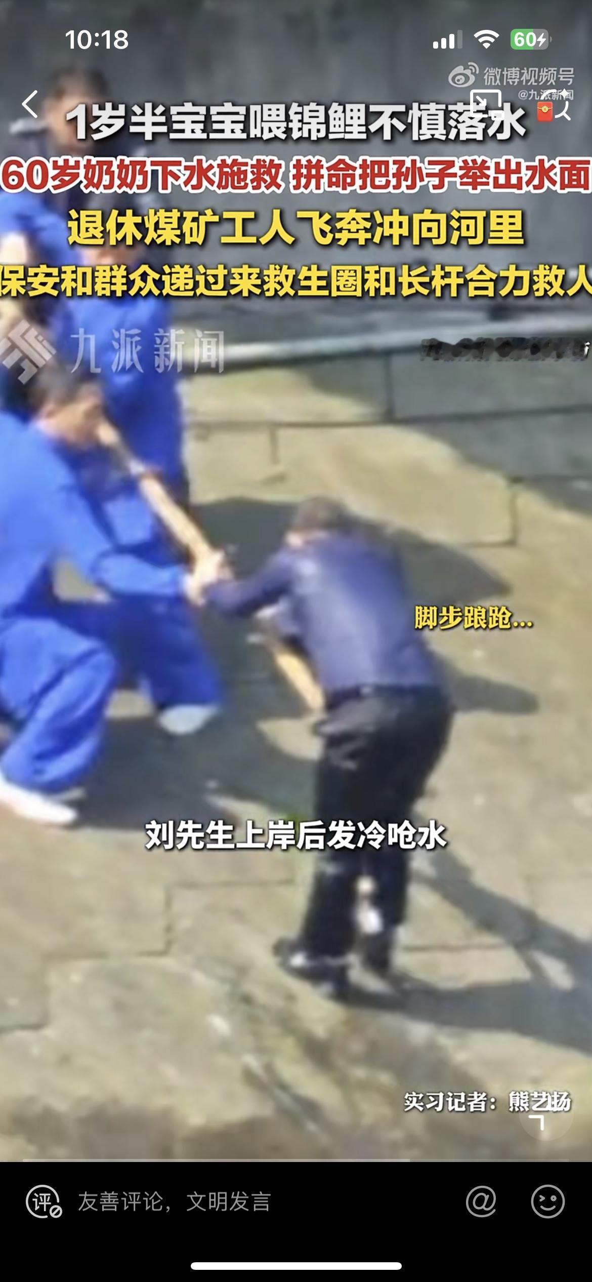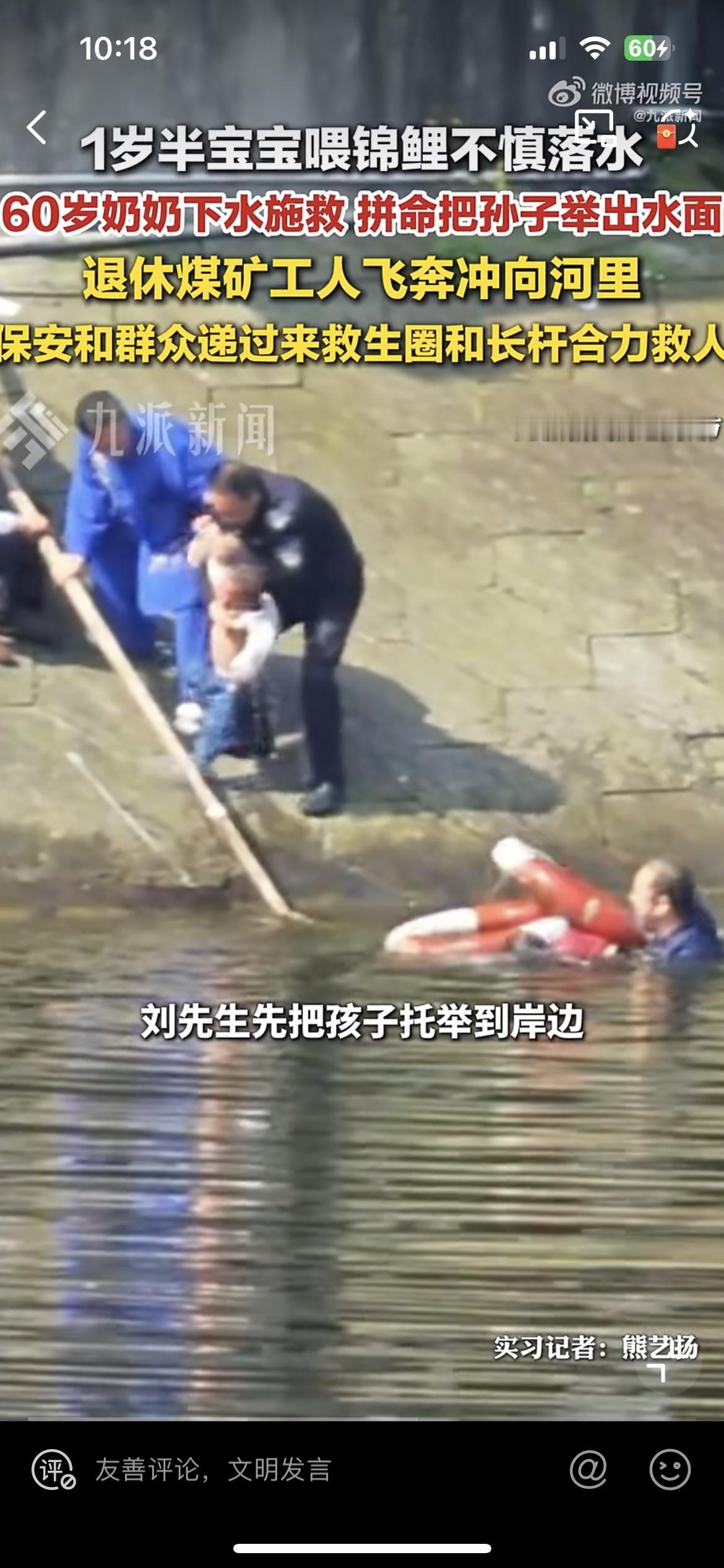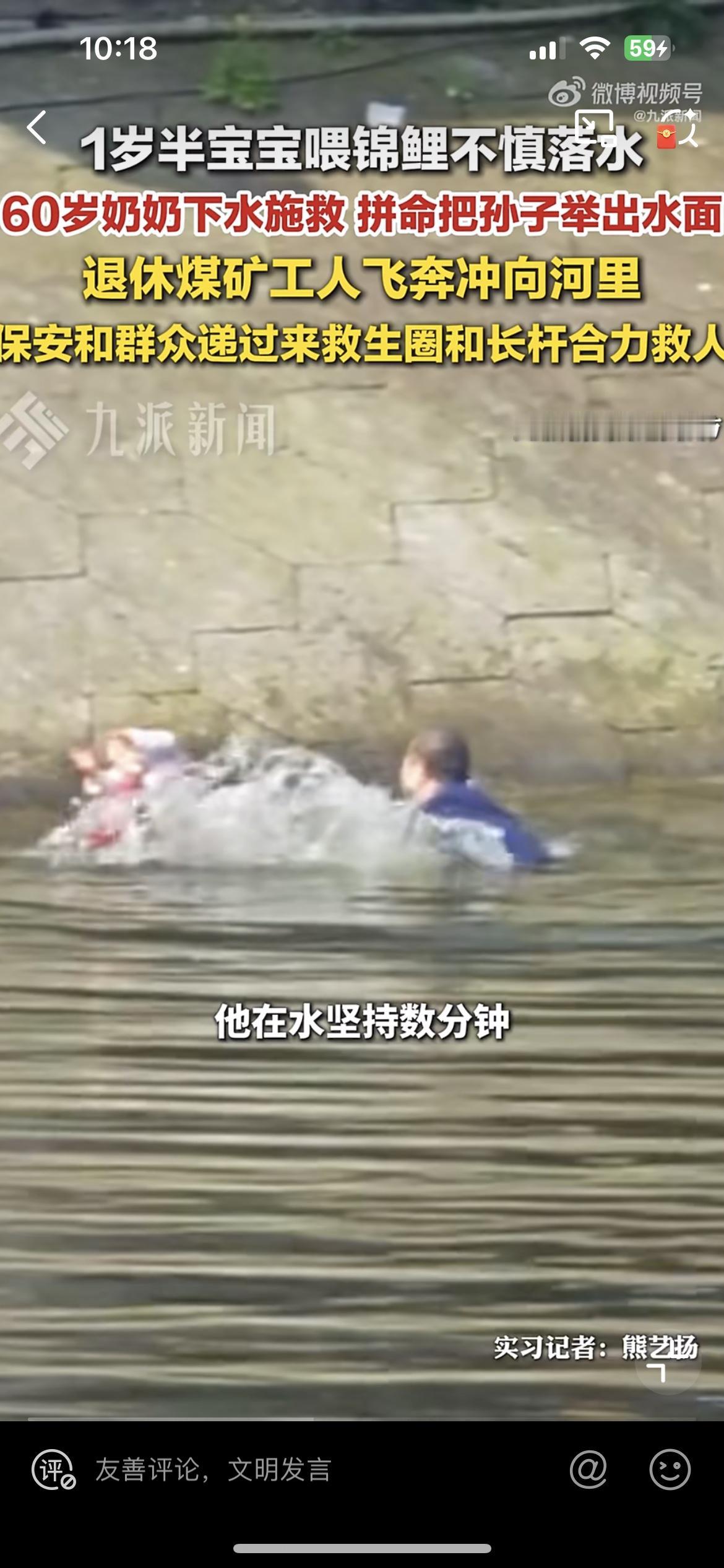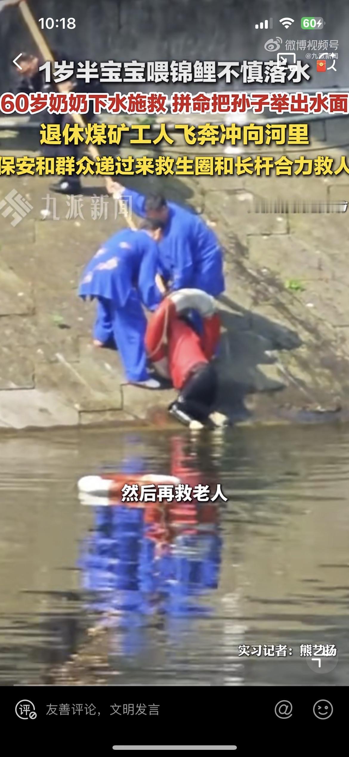 孙子喂锦鲤掉到水里,奶奶奋不过身去救,虽然她不会游泳,两人都在水里挣扎。一位退休的工人冲下水去施救,但是斜坡,水底还有青苔,根本站不起来,抓不住,三人挣扎了几分钟。还好公园人多,大家纷纷参与救援,才合力把三个人救上来。救人的老工人浑身发抖,血糖偏低,如果再晚一点,可能后果不堪设想。