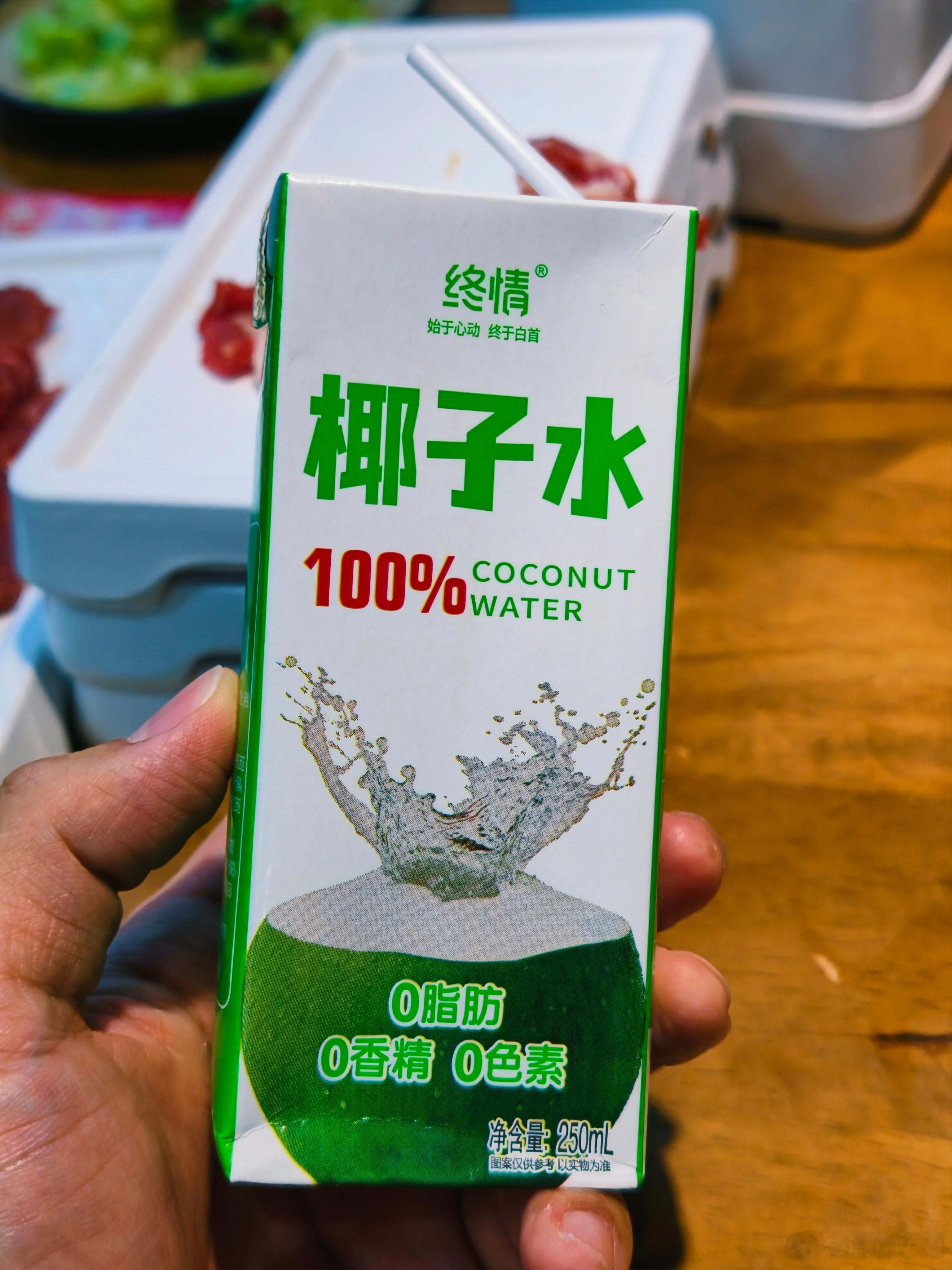 喜欢喝盒马的100%椰子水,在餐厅吃饭的时候,看到也有个椰子水,就拿来喝,我说怎