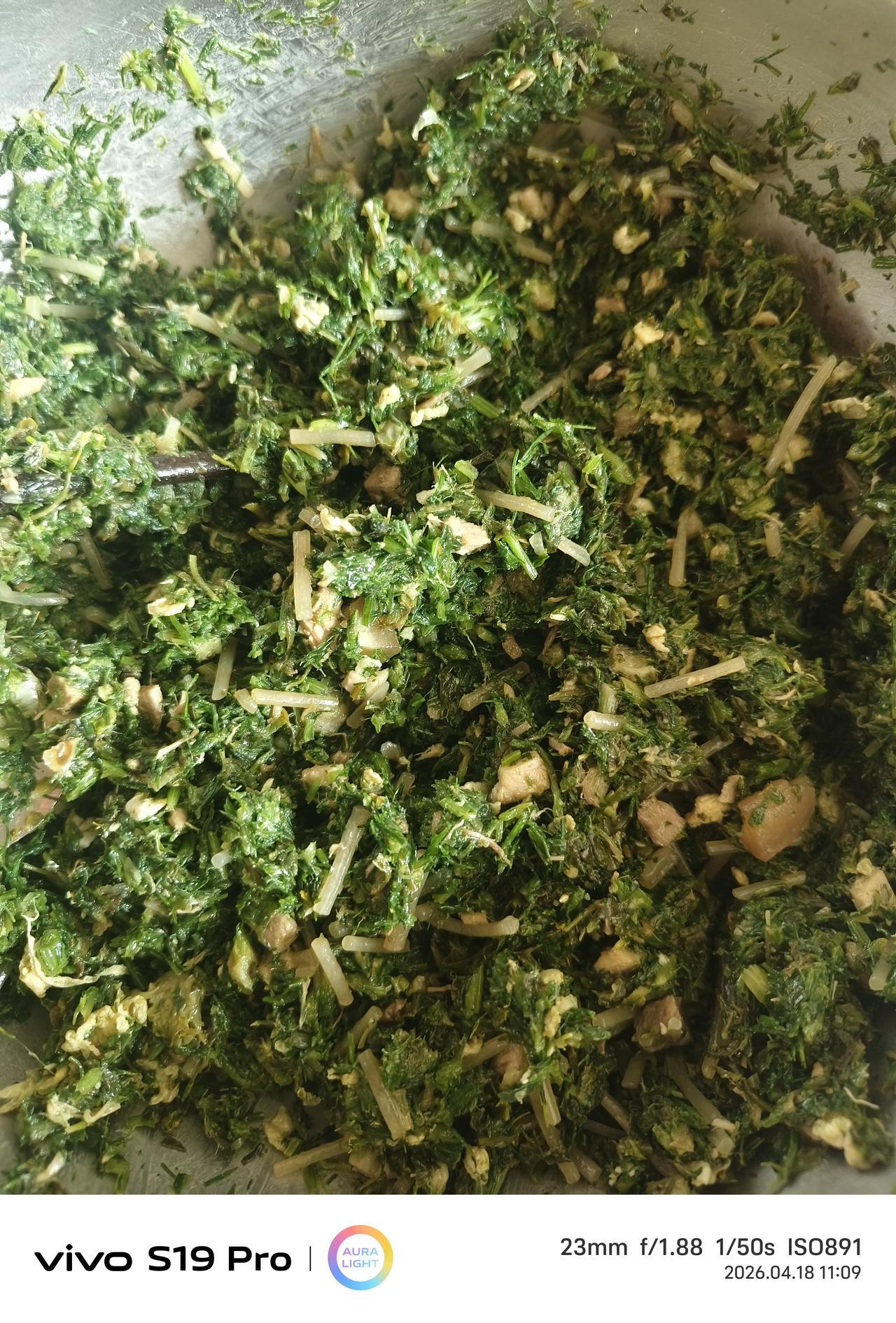 荠菜……这荠菜是顺嫂子给我的。前两天我喂鸡时,正好瞧见顺嫂子从地里打菜回来。她问我:“你爱吃荠菜吗?”我说:“行呀,爱吃,绿色天然的健康食物,谁能不喜欢呢。”顺嫂子说:“我冰箱里有焯水冻着的,我给你拿去。”我推辞道:“你辛辛苦苦打来的,别给我了。”她却说:“我有的是时间打野菜,你忙,又没时间。”