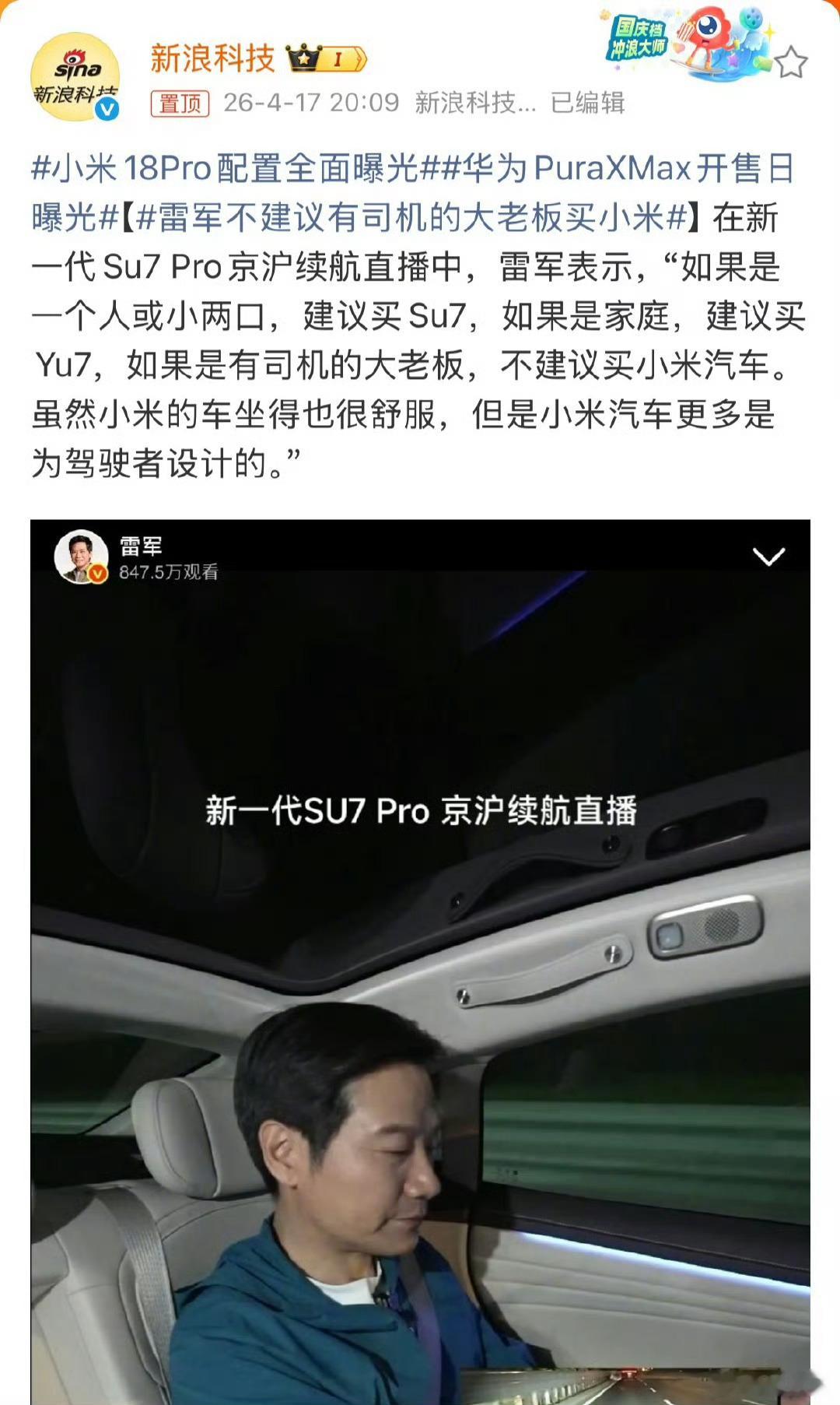 在新一代Su7 Pro京沪续航直播中,雷军表示,“如果是一个人或小两口,建议买SU7,如果是家庭,建议买YU7,如果是有司机的大老板,不建议买小米汽车。虽然小米的车坐得也很舒服,但是小米汽车更多是为驾驶者设计的。”