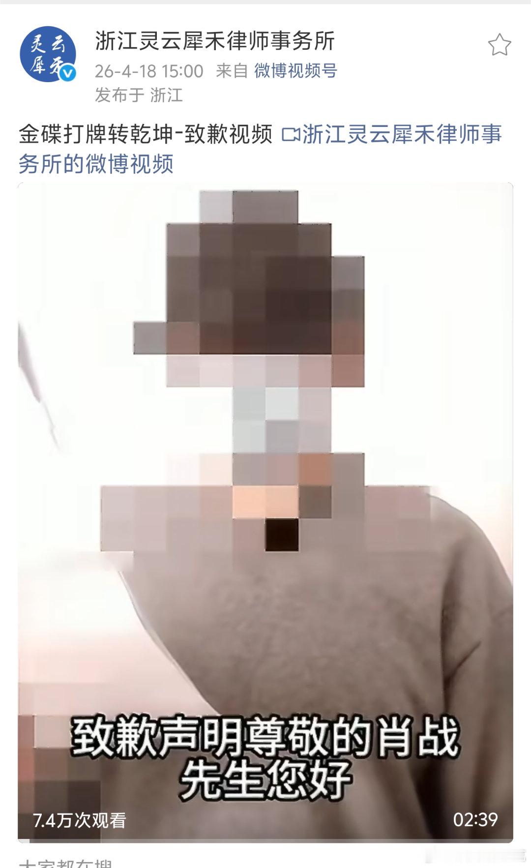 又一个造谣侵权肖战的大黑号视频道歉了,肖战方律师事务所将持续监测全平台舆情,对侵