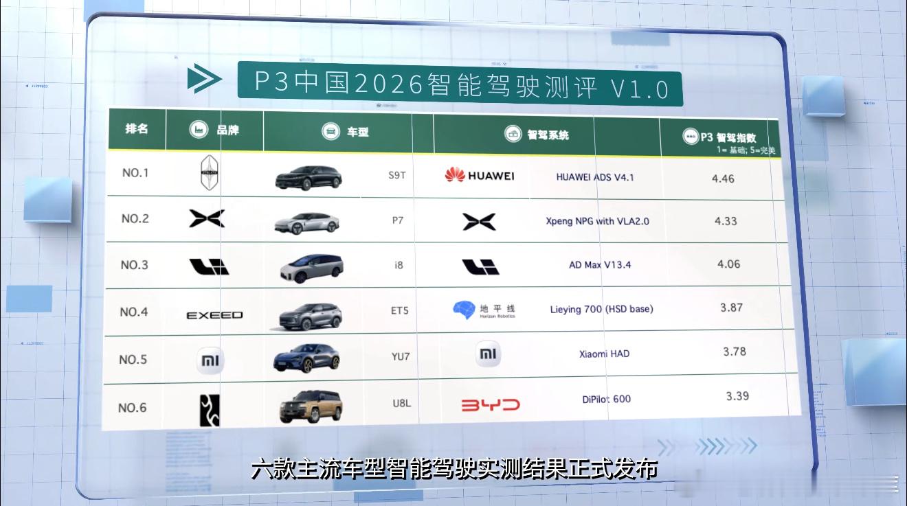 2026年P3中国智能驾驶测评昨天出来了,华为乾崑智驾ADS4.1(享界S9T