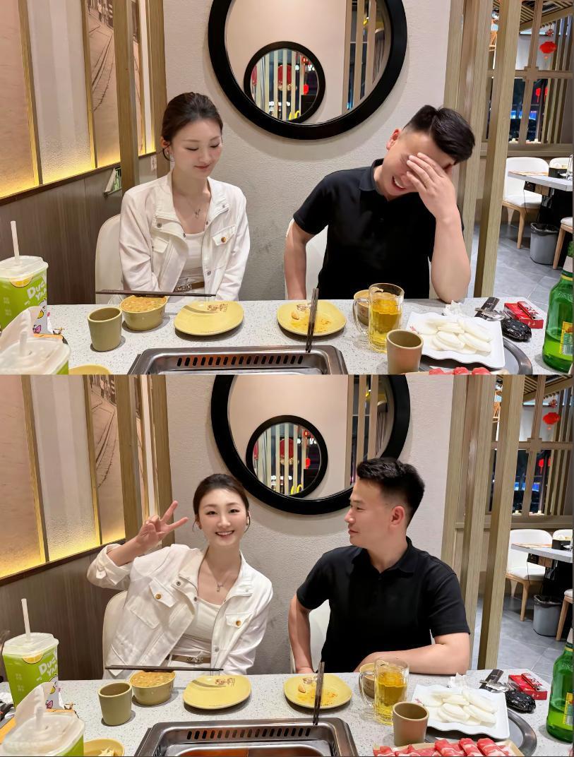 陈亚男这顿火锅吃得,隔着屏幕都能感觉到甜! 看这两张照片,她和未婚夫郭金鹏坐在火