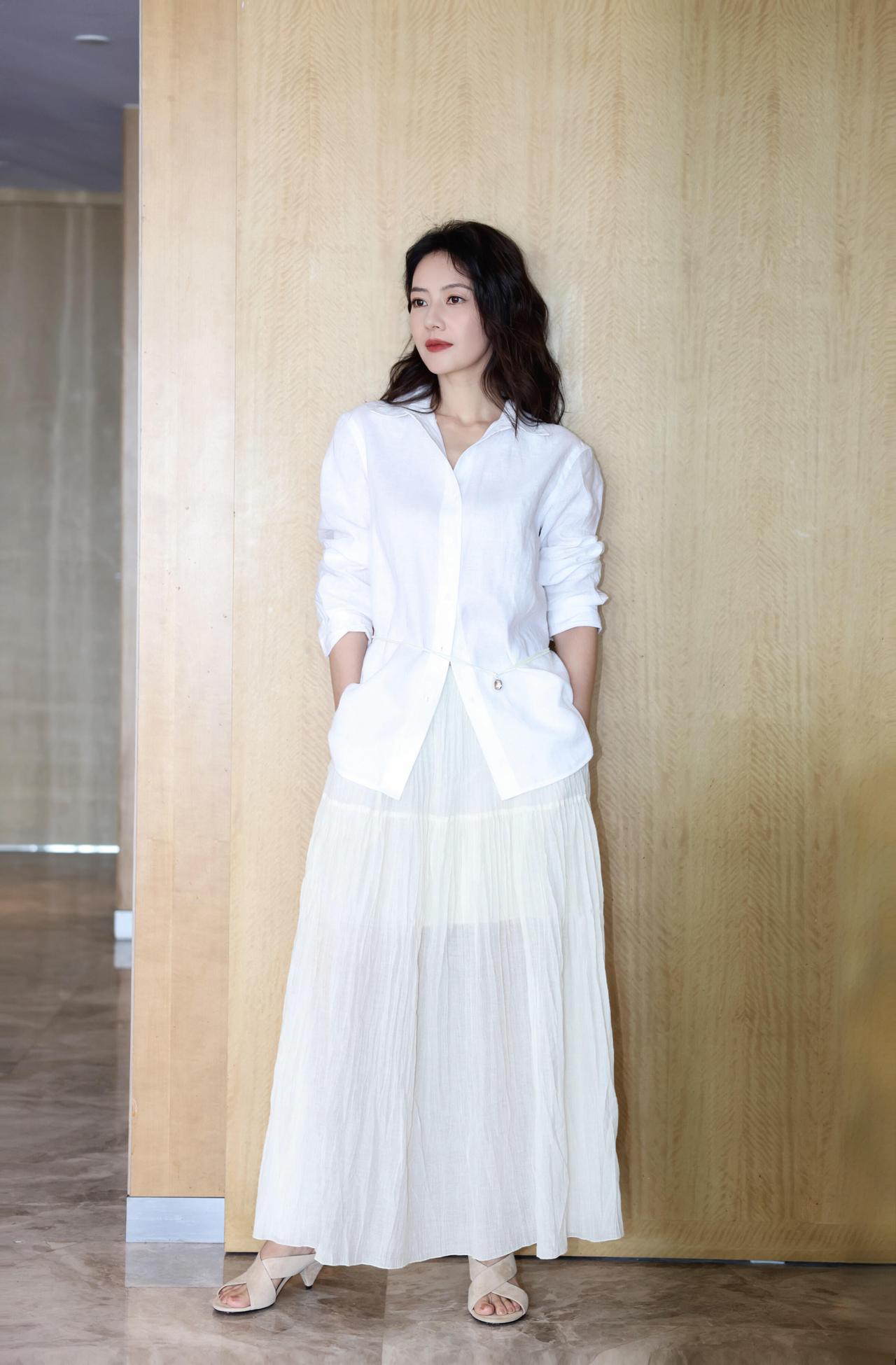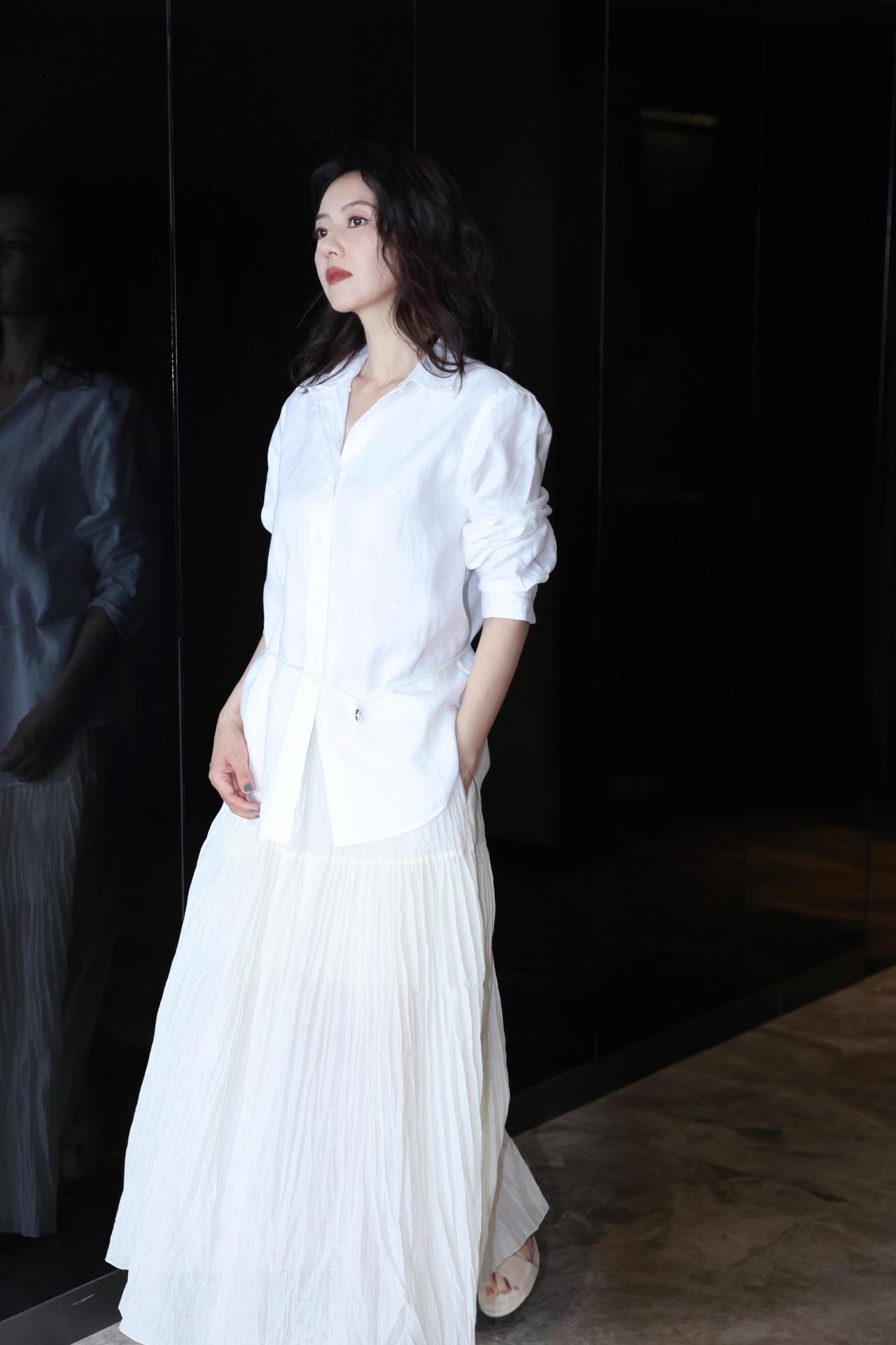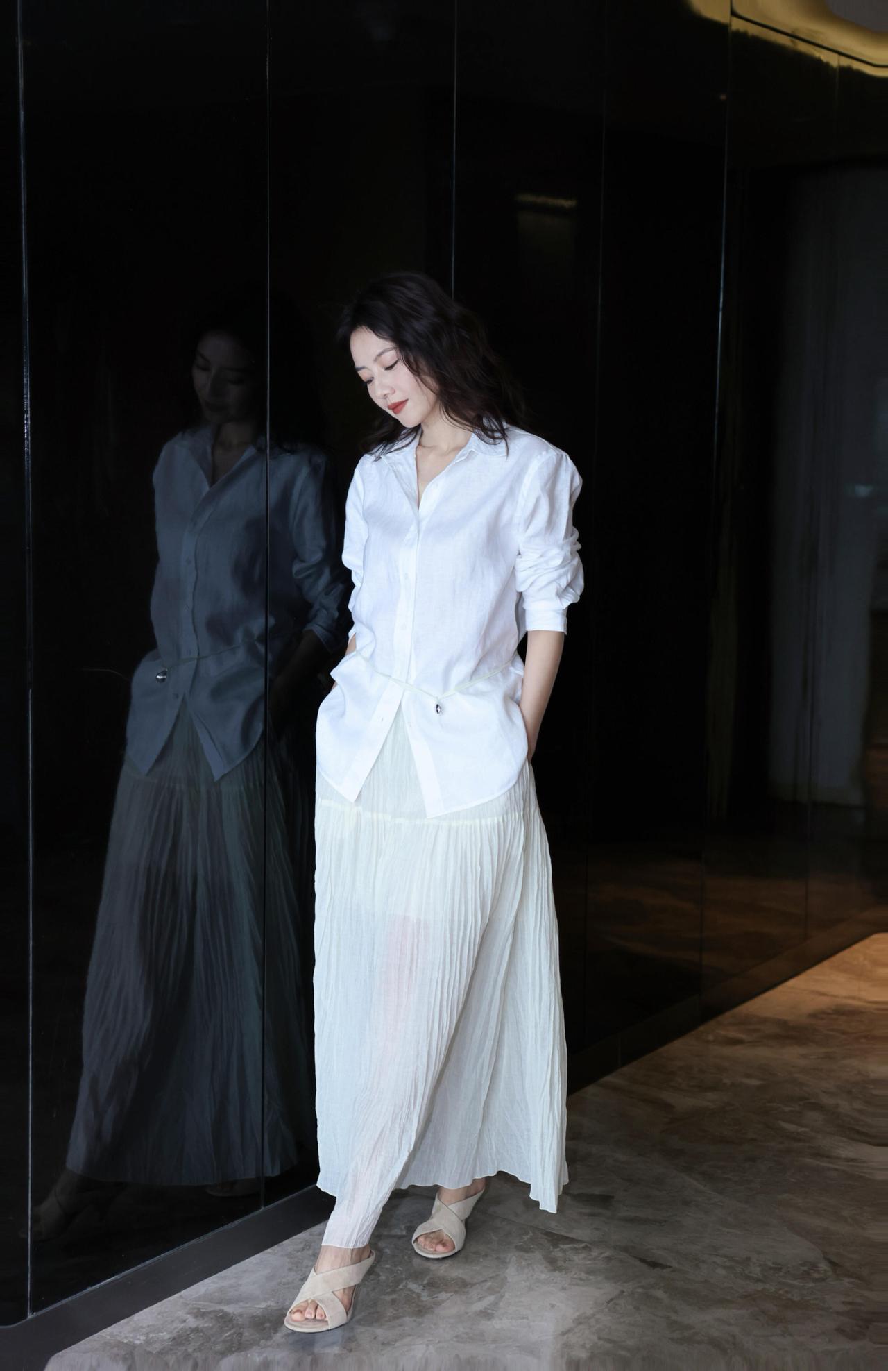 亚麻白衬衫松弛透气,腰间细腰带轻轻收出腰线,利落不拖沓。搭配褶皱白纱长裙,自带朦胧柔光感,整套全白look干净又有层次,温柔得恰到好处。搭配低跟凉鞋,简约又高级,把她独有的松弛温婉气质衬得淋漓尽致,越看越有韵味。