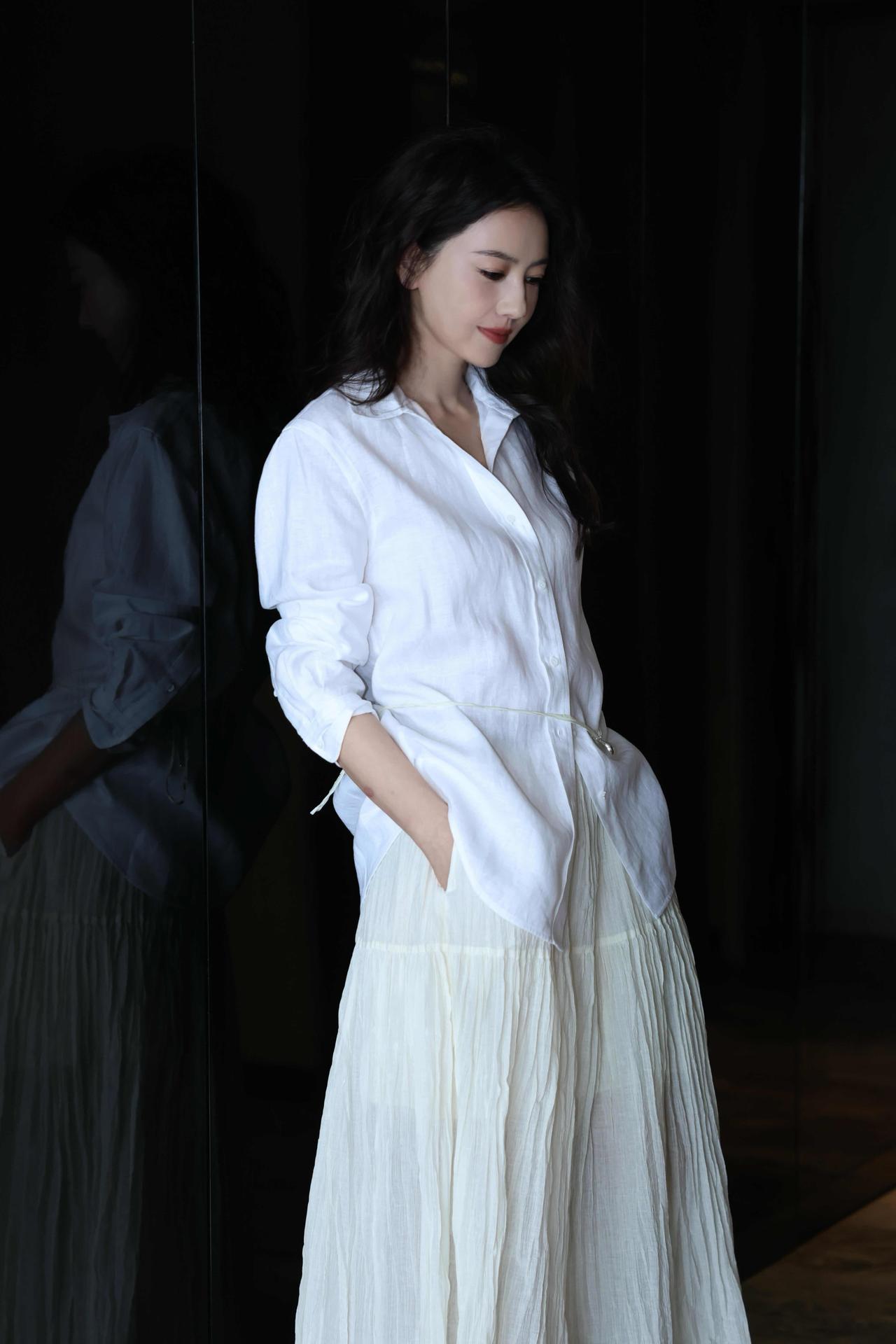 太喜欢高圆圆这个造型了,白衬衫配白裙优雅又温柔! 亚麻白衬衫松弛透气,腰间细腰带
