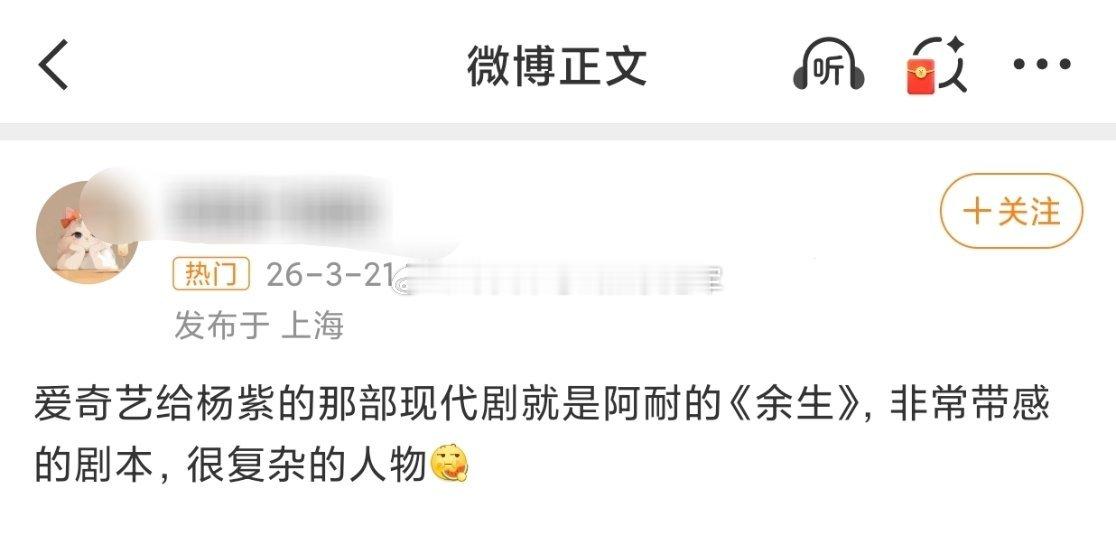 阿耐的同名小说改编,女主是迷失自我的商界女强人,人设很复杂,又一部适合冲奖的转型🍪杨紫生命树官媒发文统计