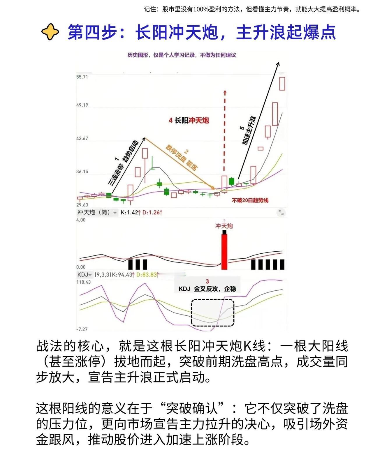 这个战法的核心,就是这根“长阳冲天炮”K线:一根大阳线(甚至涨停)拔地而起,突破前期洗盘高点,成交量同步放大,宣告主升浪正式启动。