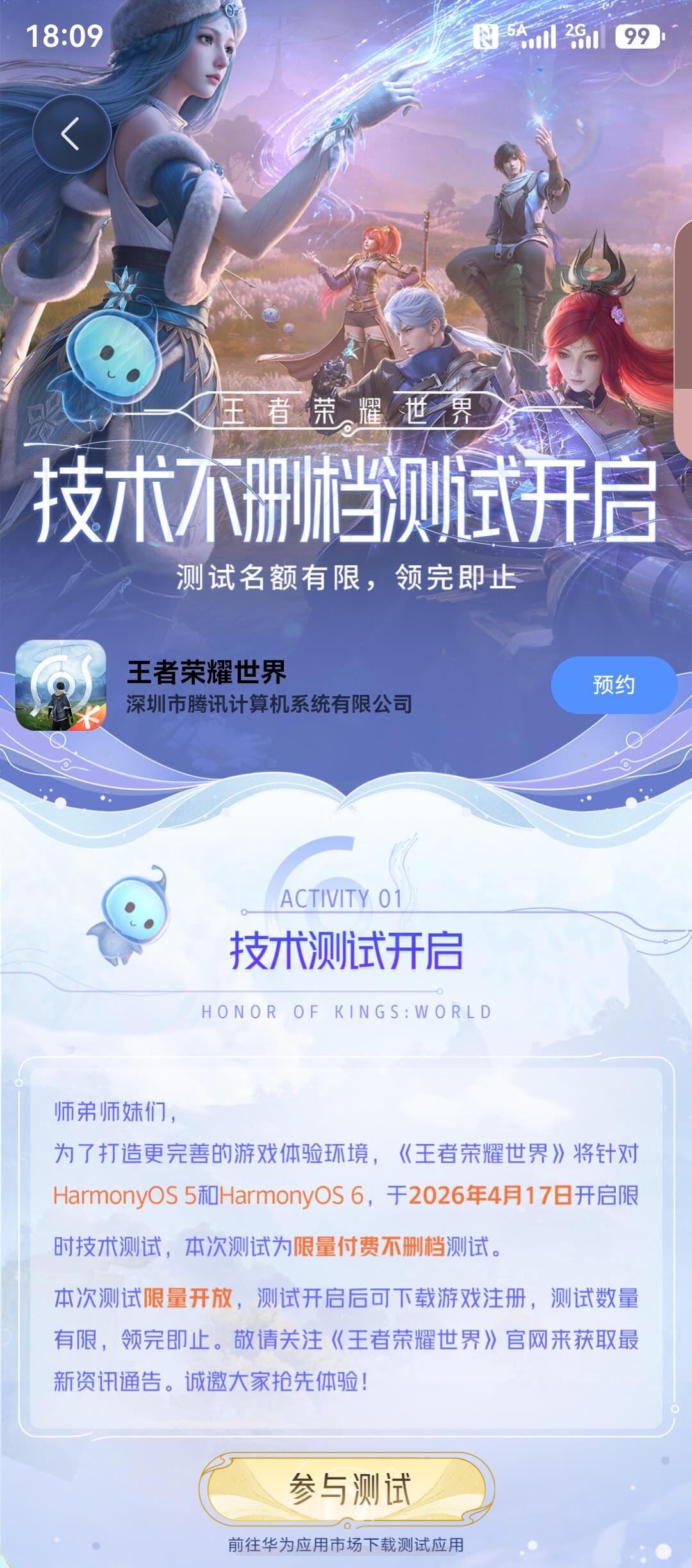 华为鸿蒙5和鸿蒙6的用户也能玩《王者荣耀世界》了,4月17日开启限量不删档技术测试,感兴趣的朋友可以尽快参与,在内置应用市场的应用尝鲜里面搜索即可。 《王者荣耀世界》是由腾讯天美工作室出品的一款王者世界多人冒险游戏。