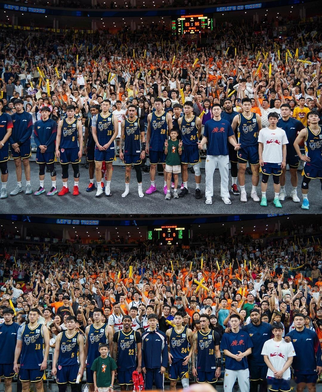 广东队全体球员和球迷大合照,主场收官战遗憾收尾,镜头里大家都没有太多笑容,期待季