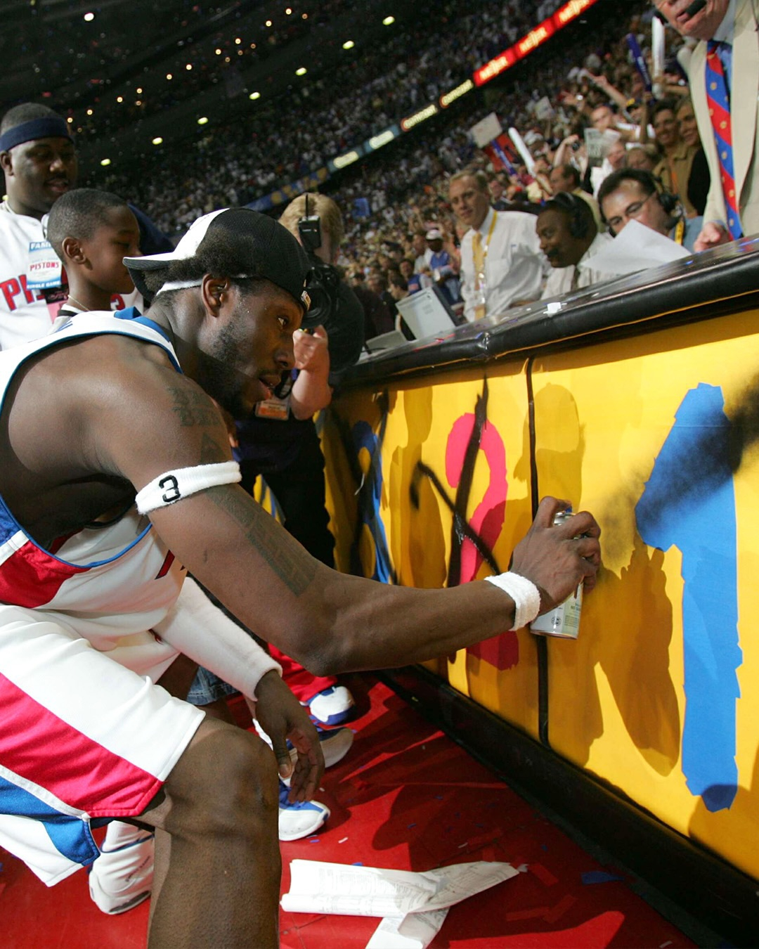 还记得2004年冠军活塞的喷漆胜利墙吧!