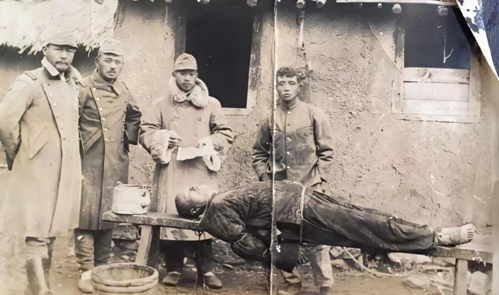 一名抗联战士被日军绑在长凳上,即将遭受水刑逼供。