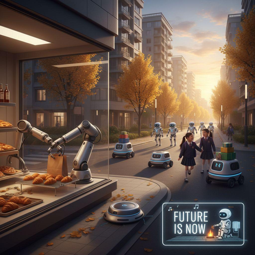 小区清晨的阳光刚刚洒下,一排银色圆盘便悄无声息地滑过路面,那是清洁机器人正用柔软的刷臂抚去最后一片落叶。转角面包店的玻璃后,机械手臂在晨光中有节奏地挥舞,像一位不知疲倦的芭蕾舞者,将刚出炉的可颂精确地夹进纸袋。快递机器人驮着五彩的包裹穿梭于楼宇之间,遇到玩耍的孩子会乖巧地停下,头顶的蓝色指示灯友好地闪烁三下。傍晚时分,陪伴型机器人领着放学的孩童走过银杏道,它们外壳上跳动着晚霞的柔光,一路播着轻快的钢琴曲。在这方小小的天地里,金属与温情交织成诗,每一个齿轮的转动都在低语:未来已来,它正蹲在屋檐下,为你烘暖一双沾了秋露的鞋。