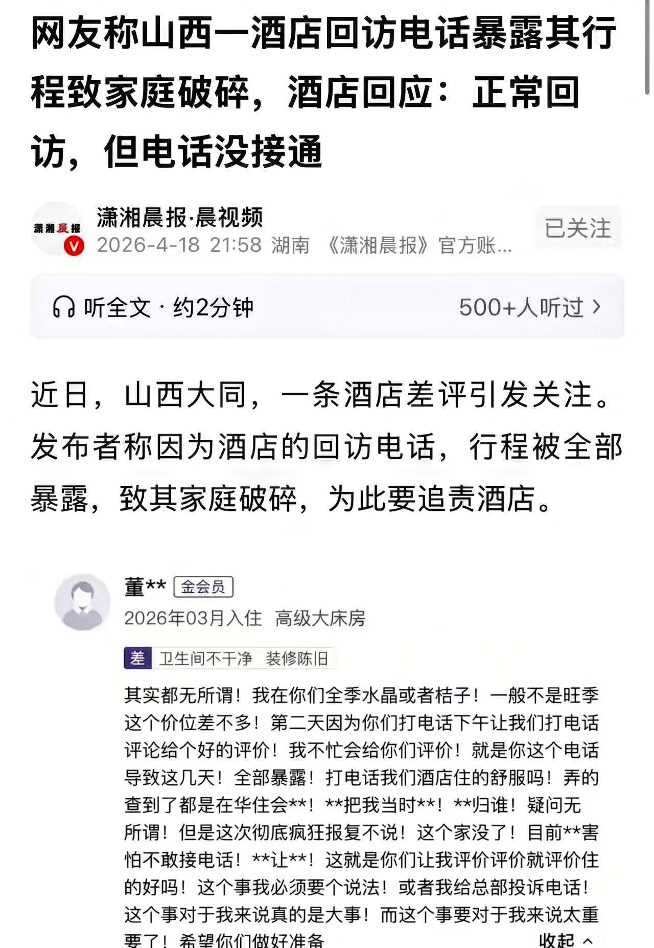 婚姻关系的基础是相互忠诚,家庭出现问题的核心原因,在于当事人违背了婚姻底线。即便没有这次酒店回访,类似行为也存在暴露的可能,将责任完全推给他人并不合理。