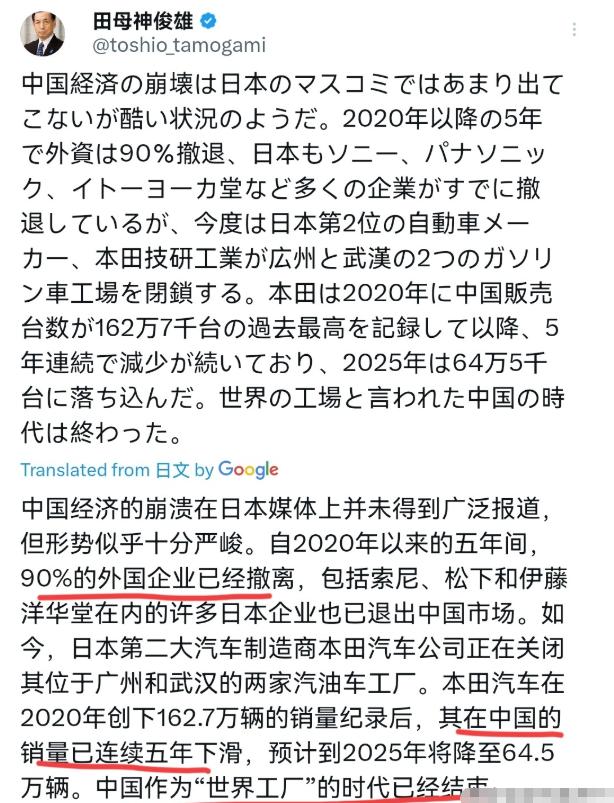 日本前航空幕僚长田母神俊雄声称,中国时代已然终结!4月19日,田母神俊雄表示,虽然日本媒体很少报道“中国经济崩溃”,但情况似乎十分严峻。2020年之后的五年间外资“已撤离”90%,日本方面索尼、松下、伊藤洋华堂等众多企业也已“撤出”。此番日本第二大车企本田技研工业,将关闭位于广州和武汉的两家燃油车工厂。
