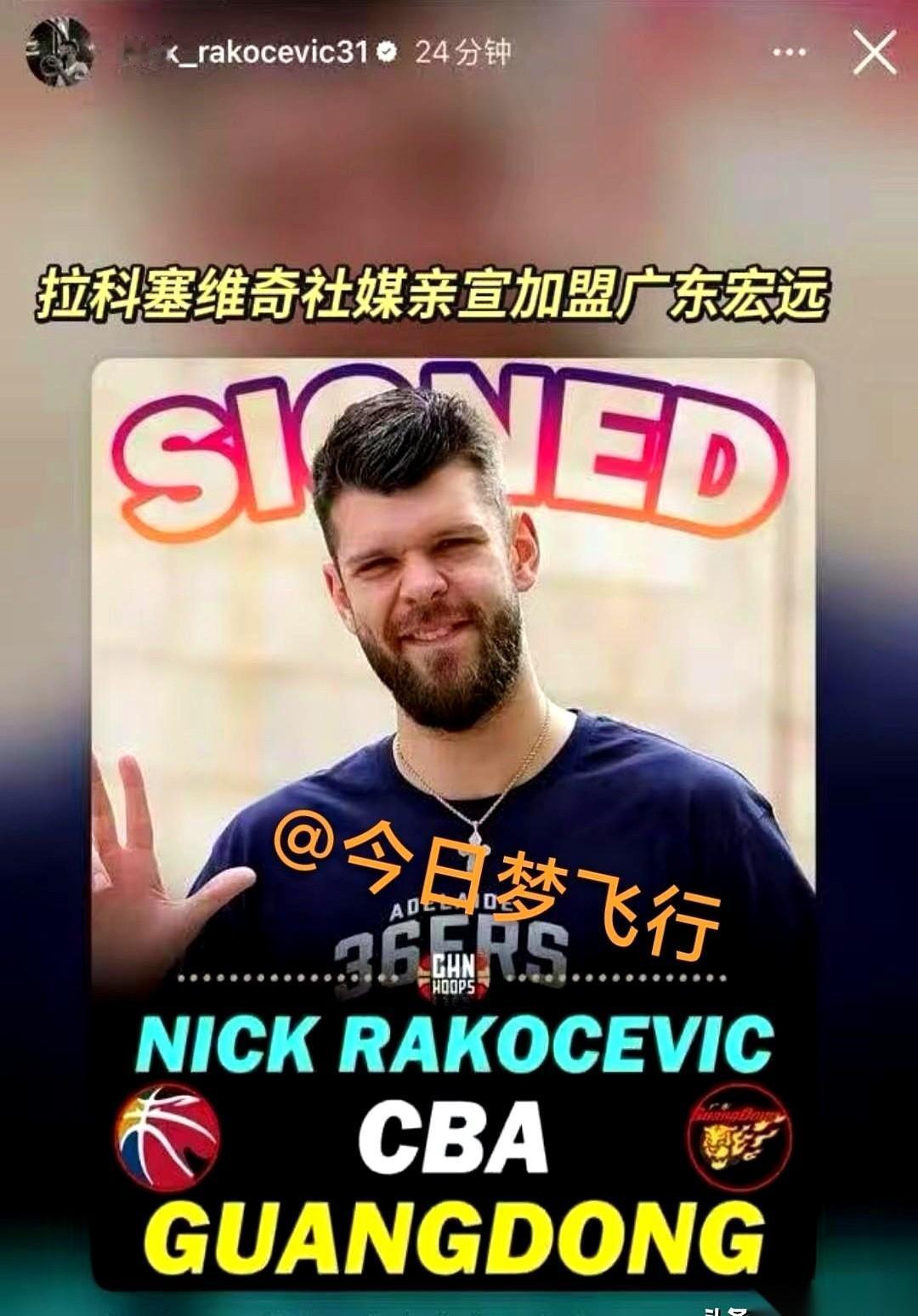 拉科塞维奇在个人账号上发了话,广东男篮这笔新外援签约算是彻底落了听。