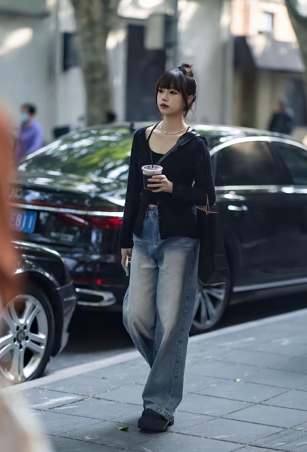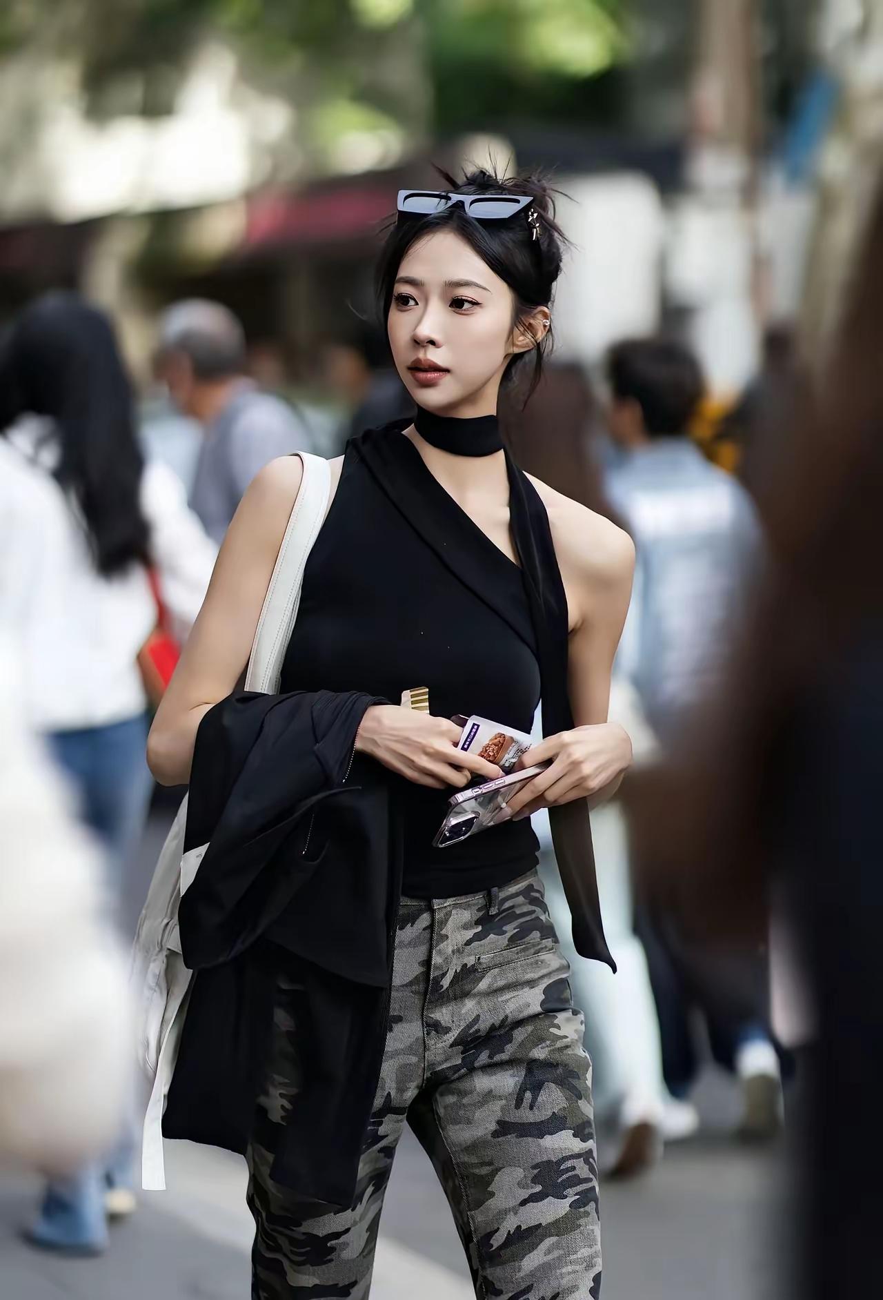 江疏影街拍,一身黑色蛮帅气!她身穿黑色运动套装,廓形外套搭配同系列长裤,利落又
