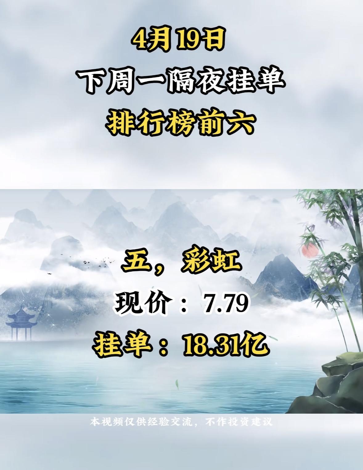 4月20日隔夜挂单排行榜前六里,彩虹股份很是惹眼。它现价7.79元,挂单竟达18.31亿。对比下周末暗盘隔夜单TOP8里那些热门股,利欧股份现价7.46元,隔夜挂单39.18亿领跑;鲁信创投现价32.59元,挂单36.85亿;金风科技31.94元,挂单34.23亿。彩虹股份虽挂单金额没它们高,但18.31亿也不是小数目。这说明资金对它也有一定关注度。不过咱普通投资者可别盲目跟风,得搞清楚背后的逻辑,投资还得守住自己的风险底线。