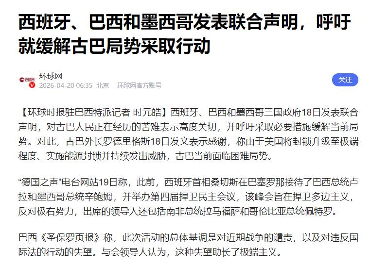 这次三个国家联手发声,就是替弱小出头,反对霸权。希望援助能快点到,也希望古巴老百姓能过上安稳日子,这就是最实在的公道。