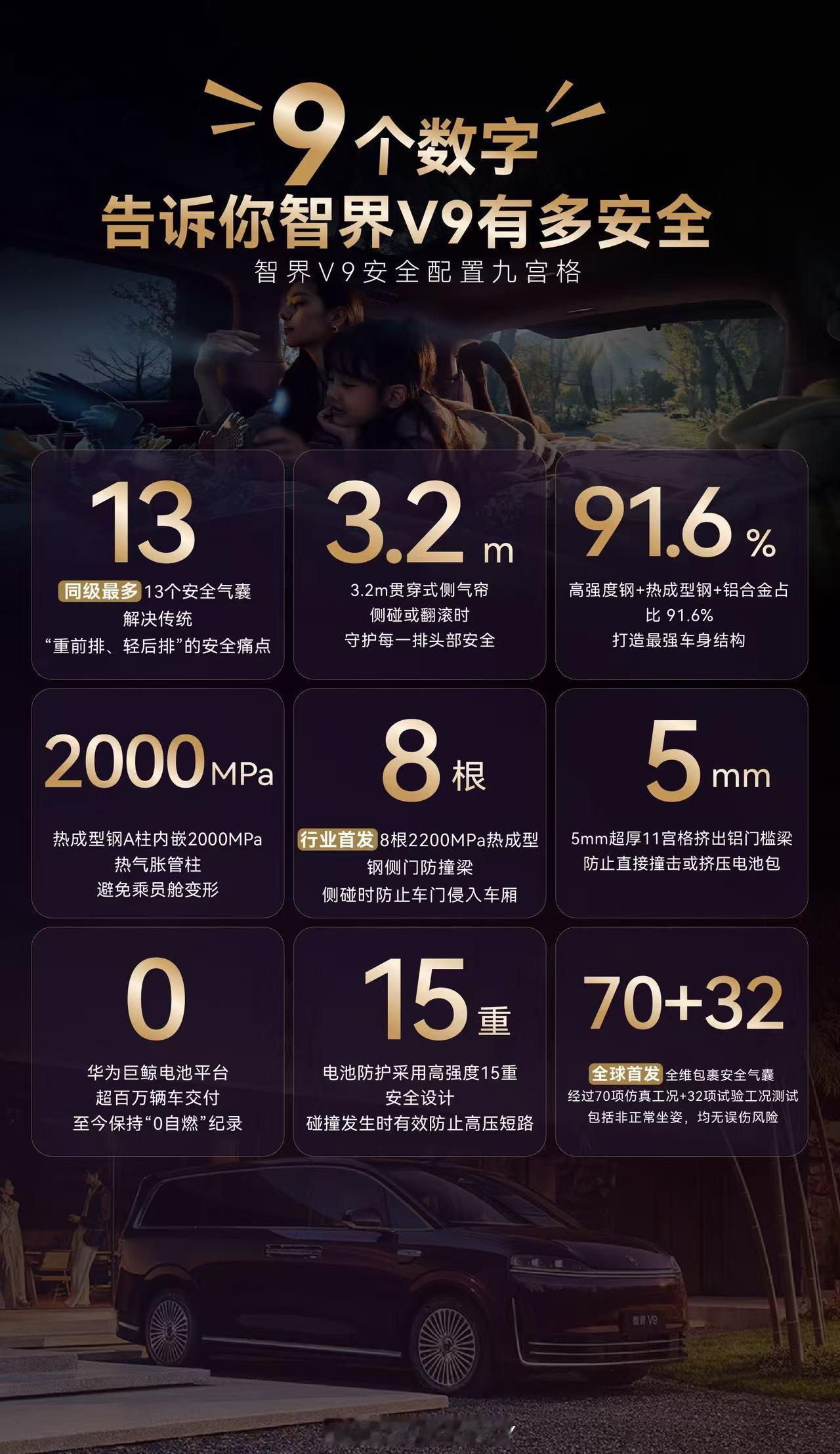 智界V9首发同级最多安全气囊智界V9以13个安全气囊引领同级,赵长江认证被动安全超行业标准。二排零重力座椅亦享全包裹防护,全家出行,安全直接满配!赵长江说智界V9被动安全远超行业标准