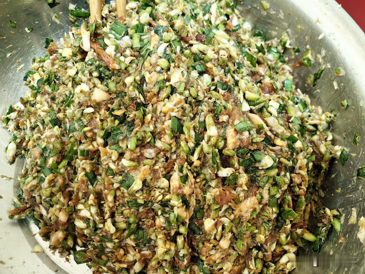 馅里边有大肉,粉条,槐花,加一把韭菜,韭菜是用来提味的。