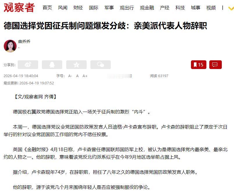 可能有人不熟德国选择党,它是个极右翼政党,近几年在德国势头很猛,尤其是东部,支持率最高能到40%,但内部一直不太平,派系多,平时就矛盾不断,这次征兵制只是把矛盾摆到了台面上。