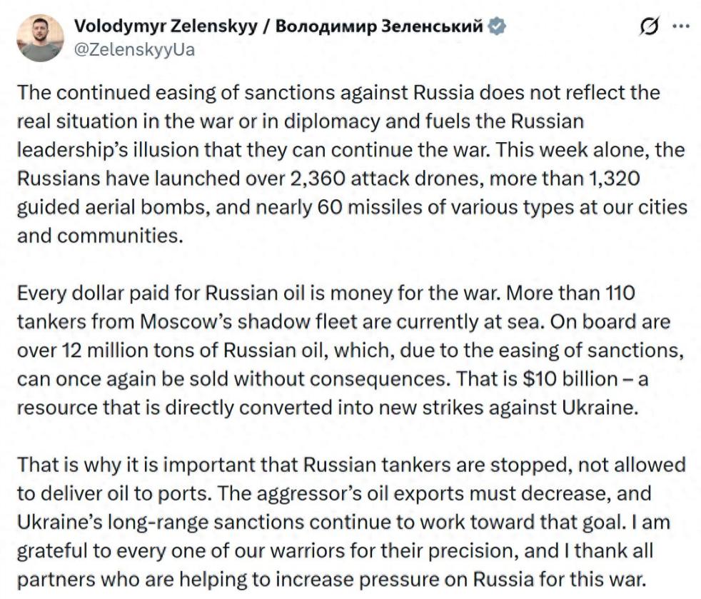 泽连斯基心里门儿清,乌克兰能不能继续打,全看西方帮不帮、对俄制裁严不严。现在美国带头松制裁,其他国家说不定也跟着学,到时候俄罗斯钱越来越多,乌克兰就真的没希望了。