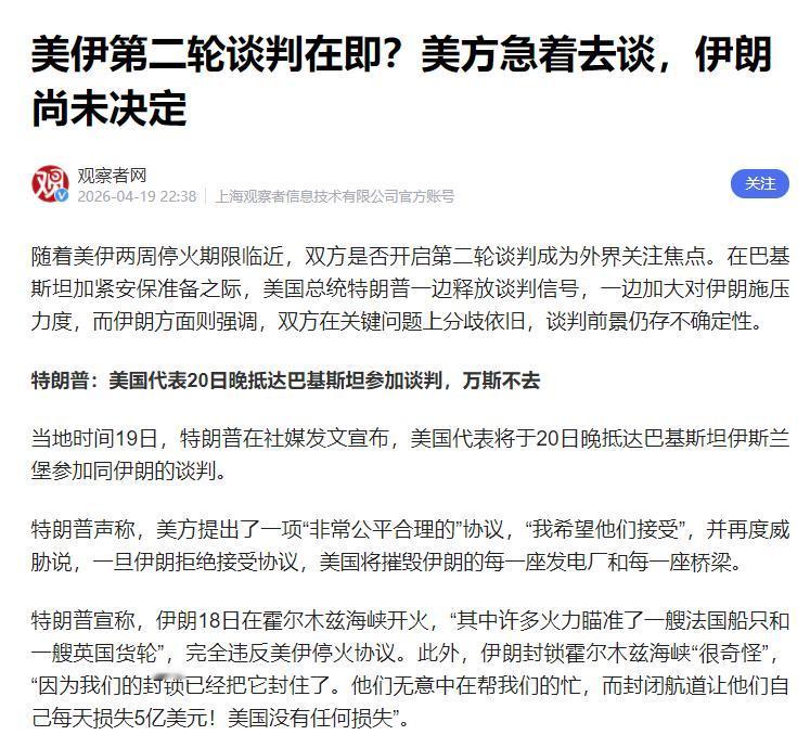 现在最受关注的国际事儿,就是美国和伊朗的第二轮谈判。简单说,俩国之前说好停火两周,眼看4月22号就到期了,美国这边急得不行,特朗普天天喊着“马上就能谈成”,还派了代表往巴基斯坦赶,一边喊谈判一边放狠话。