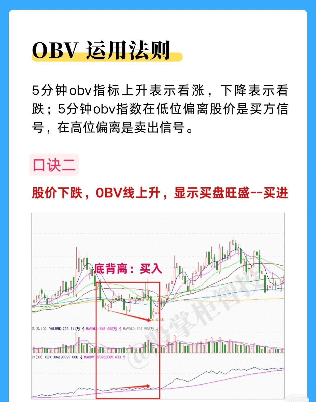 5分钟周期的OBV指标,上升则预示短期看涨,下降则预示短期看跌;若5分钟OBV在低位偏离股价(OBV提前或同步于股价筑底回升),是买方信号(资金悄然吸筹);若在高位偏离(OBV先于或同步于股价见顶回落),则是卖出信号(资金加速离场)。
