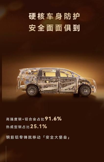车身采用 “11 横 6 纵” 架构,高强度钢、热成型钢及铝合金综合占比达 91.6%,其中 25.1% 为潜艇级热成型钢,A 柱内嵌 2000MPa 热气胀管柱,侧门配备 8 根 2200MPa 热成型钢防撞梁,全方位筑牢车身防线。