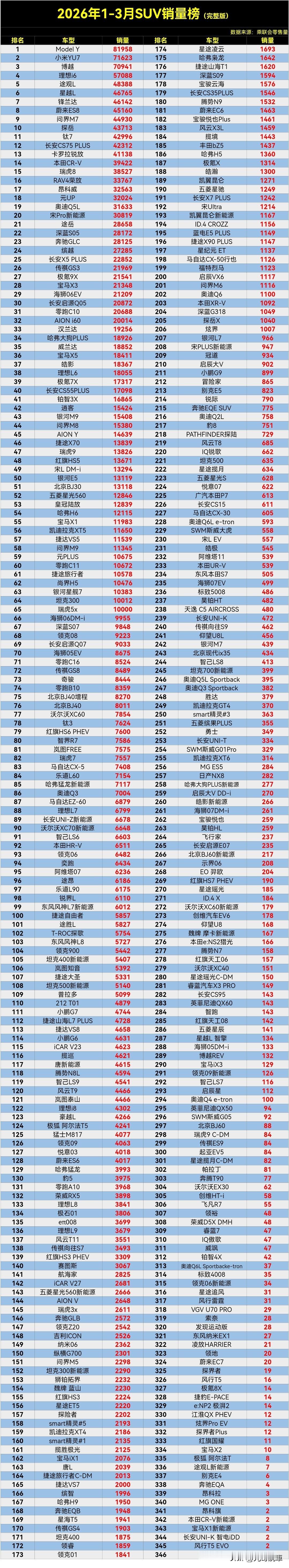 刚看到的2026年1-3月SUV零售销量排行榜完整版,共有300多款车型[泣不成声],看了都眼花了,找了几遍都没有看到自己的车,最后发现在310多名,一个季度不到40台销量,这是要停产的节奏了吗?以后修车配件是个大问题了[黑线]。