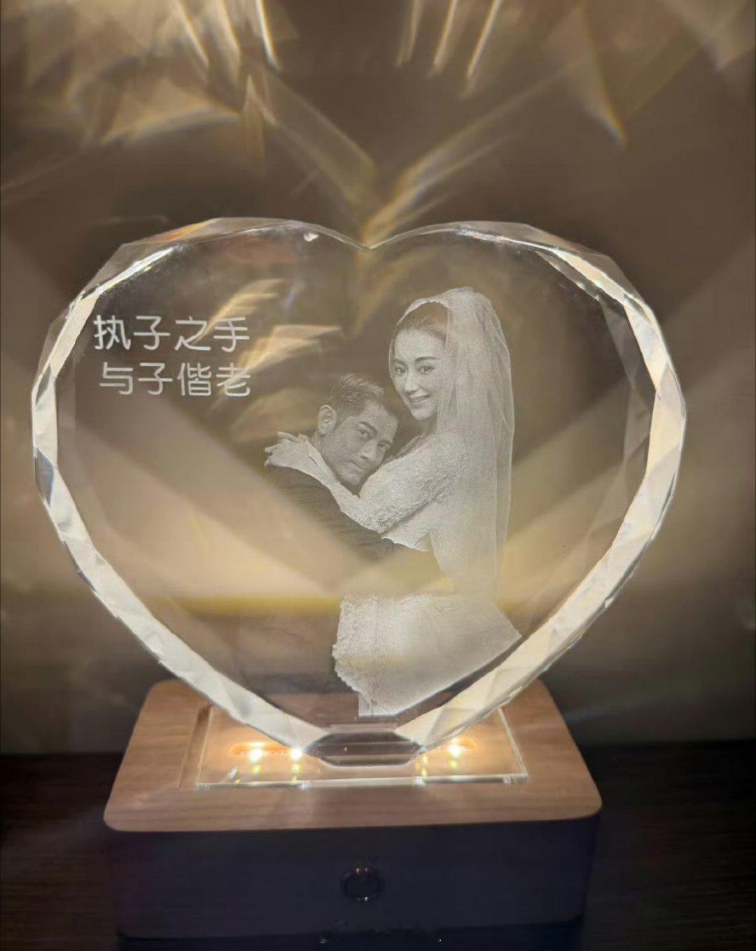 方媛晒出来了郭富城在九周年纪念日给她准备的礼物,就是一个爱心玻璃里面有他们的合照
