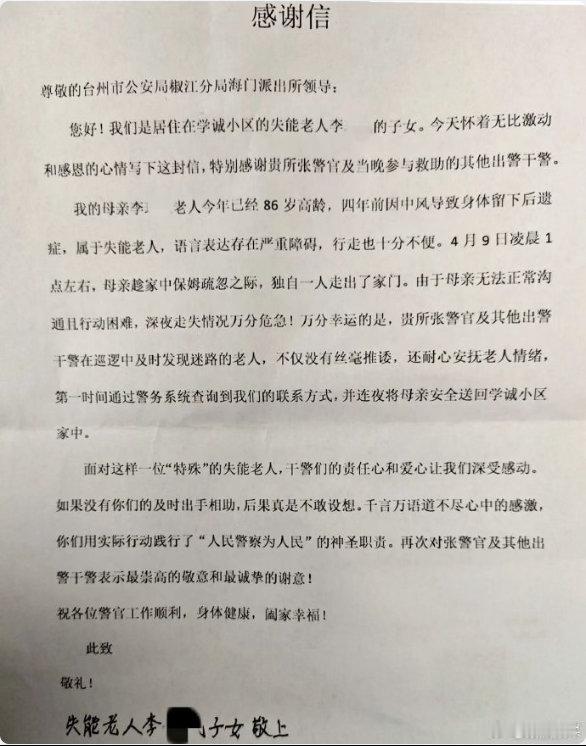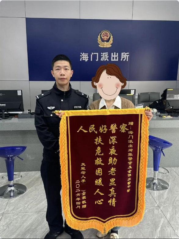 台州新警暖心护送86岁失能老人回家 椒江海门派出所接警后,新警张过之带队救助中风走失老人,核实身份送其回家,家属赠旗致谢。