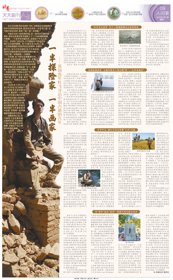 2026年3月底,杜飞首个个人画展“笔载”在北京杖藜书院举办,回顾自己在中国九年手绘古迹的心路历程。该展览的英文名为ArtistandAntiquary,杜飞认为可以解读为“一半画家,一半探险家”。“Artist译为画家,而Antiquary比较复杂,不太好翻译,若按网络上翻译为‘古文物研究者’‘古董商家’‘文物爱好者’并不准确。这个词有些古老,它在19世纪已经有了好几个含义,而这个词在现在有些‘传统探险家’的意味。以前,我不认为自己是‘探险家’,我只是喜欢研究文物,也不喜欢热闹的旅游景点,只去寻访很小众的地方。而现在的我确实有些‘探险家’的感觉了,比如我在甘肃四十多摄氏度的情况下,骑行了一百多公里,还爬了三个沙漠的山头。但我不会为了爬山而爬山,我是为了寻访古遗址,我也不会为了骑行而骑行,访古是我的目的。我的画作也都是关于古建筑的,因此如果不访古,我便不想画画了,如果不继续画画,估计我也不想出门。画家和探险家,是我的两个重要身份。”